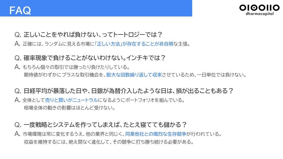 ダルマ・キャピタル 塩谷CEOは、「当社の現物株式の売買代金は、直近では1日1000億円を超える日が多くなっている。それ以外にデリバティブズの取引も行っている。取引は、東京証券取引所、東京金融取引所、JNX証券を含む全てのPTSで、株式やデリバティブズのアルゴリズム取引を行っている。JNX証券、Cboeジャパン、大阪デジタルエクスチェンジや東京金融取引所では指定マーケットメーカーとして市場の流動性提供に貢献できていることを嬉しく思っている。また、当社の社員は、アカデミアでキャリアを積んだサイエンティストたちがほとんどで、実際、他の金融機関での職務経験があるのは私だけ。そういう点においても一般的な運用会社や証券会社とは雰囲気が少し違うと思う」と説明しました。さらに、HFTについてよく尋ねられる質問についても解説していただきました(画像参照)。