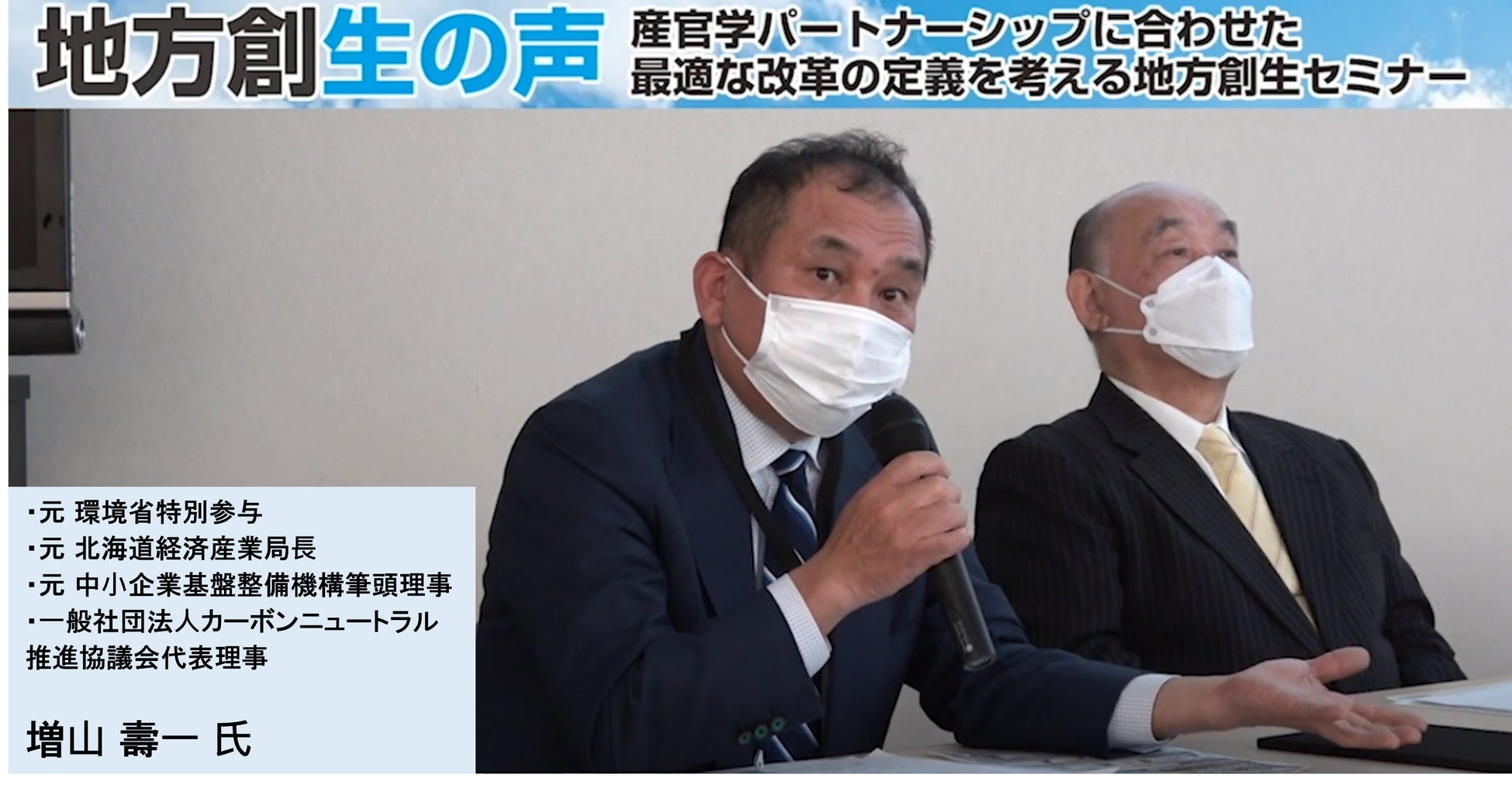 脱炭素推進に向けたアクションが加速する中、当社は2021年12月22日に参議院議員会館にて、一般社団法人カーボンニュートラル推進協議会の代表理事を務め、元環境省特別参与、増山壽一氏をはじめ「脱炭素社会」の実現に向けた取り組みについての有識者を招聘し、「地方創生の声」セミナーを主催しました。オンライン配信も同時に行い多くの自治体、企業にご参加いただきました。