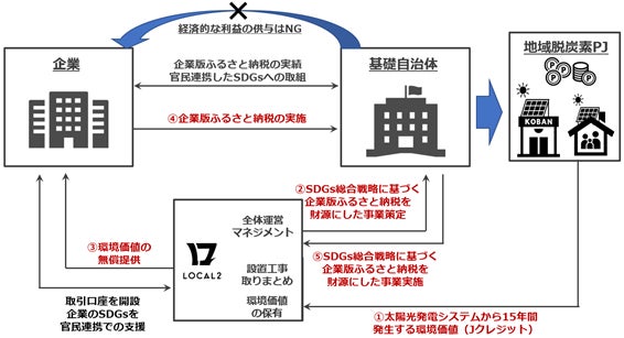 LOCAL2は、当社が協働で取り組んでいるシェアリングエネルギーとの「地域脱炭素プロジェクト」で地域の公共施設の屋根、民間の戸建て(築30年未満)の屋根をお借りし、太陽光発電システムの無償設置を通じて、自治体の“地方公共団体実行計画”を自治体からの自主財源負担無しで推進する、“ゼロカーボン”の実現へ向けて取り組んで参りました。