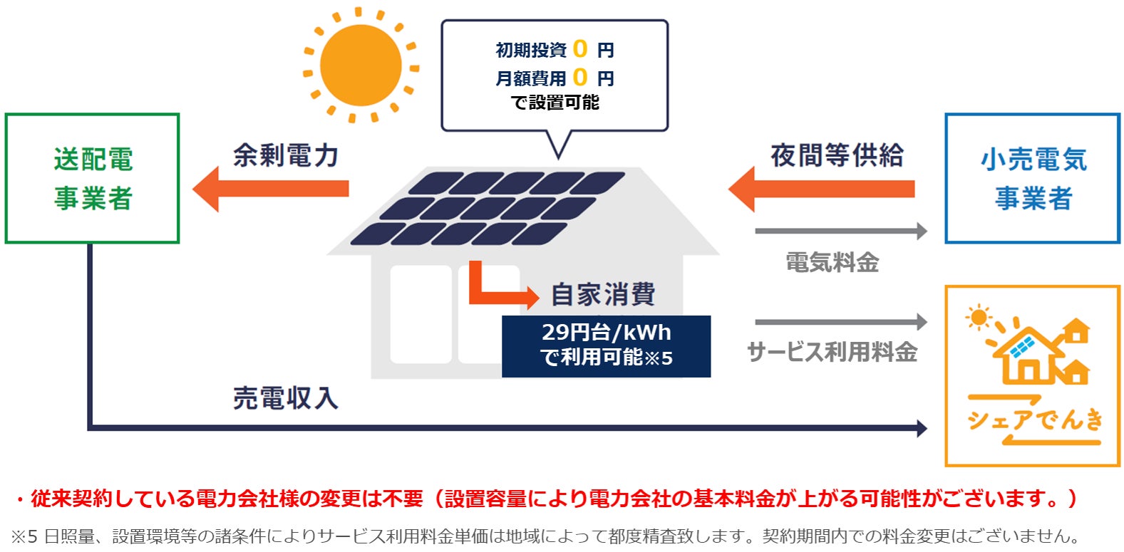 この包括連携協定は、田川市の“地方公共団体実行計画”を同社の「地域脱炭素プロジェクト」によって自治体の自主財源からの負担無しで推進し、市の“ゼロカーボン”を支援する取り組みです。この取り組みによって、田川市は、市内の公共施設及び民間の戸建て(築 30 年未満)を対象に、初期費用無料で、太陽光発電を設置しご利用いただけるシェアリングエネルギーのサービス「シェアでんき」の普及を支援していきます。シェアリングエネルギーが、太陽光パネルを設置し、余剰電力の売電収入と自家消費課金収入を15年間に渡って得る事により、一件当たり約150万円以上の初期投資負担がある太陽光発電システムを公共施設並びに民間戸建てへの無償設置することができます。