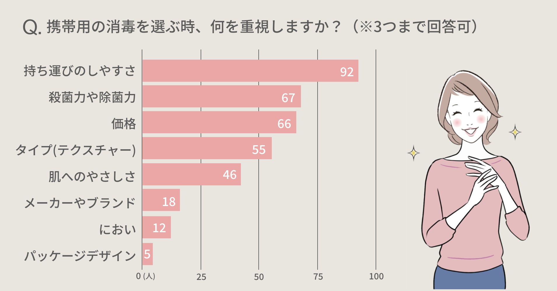 また、その「携帯用手指の消毒を選ぶとき、何を重視して選びますか?」(※3つまで選択可)とお尋ねしたところ、「持ち運びのしやすさ」が92人でいちばん多く、「殺菌力や除菌力」67人と「価格」66人がほぼ同じ、「タイプ(テクスチャー)」55人、「肌へのやさしさ」46人という結果でした。