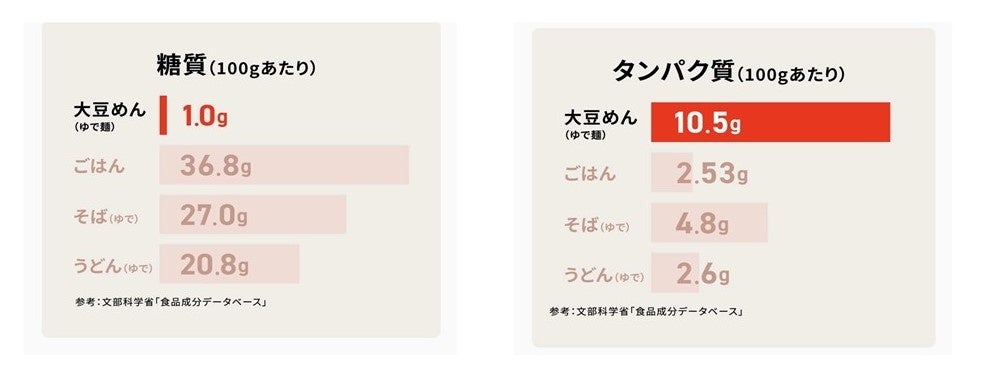 「⼤⾖めん」は1⾷(40g)あたりの糖質が6.2g、ゆでた後は1.3gとなり、圧倒的な低糖質を実現。たんぱく質も豊富にとることができ、⽇ごろの健康や活⼒も維持できます。