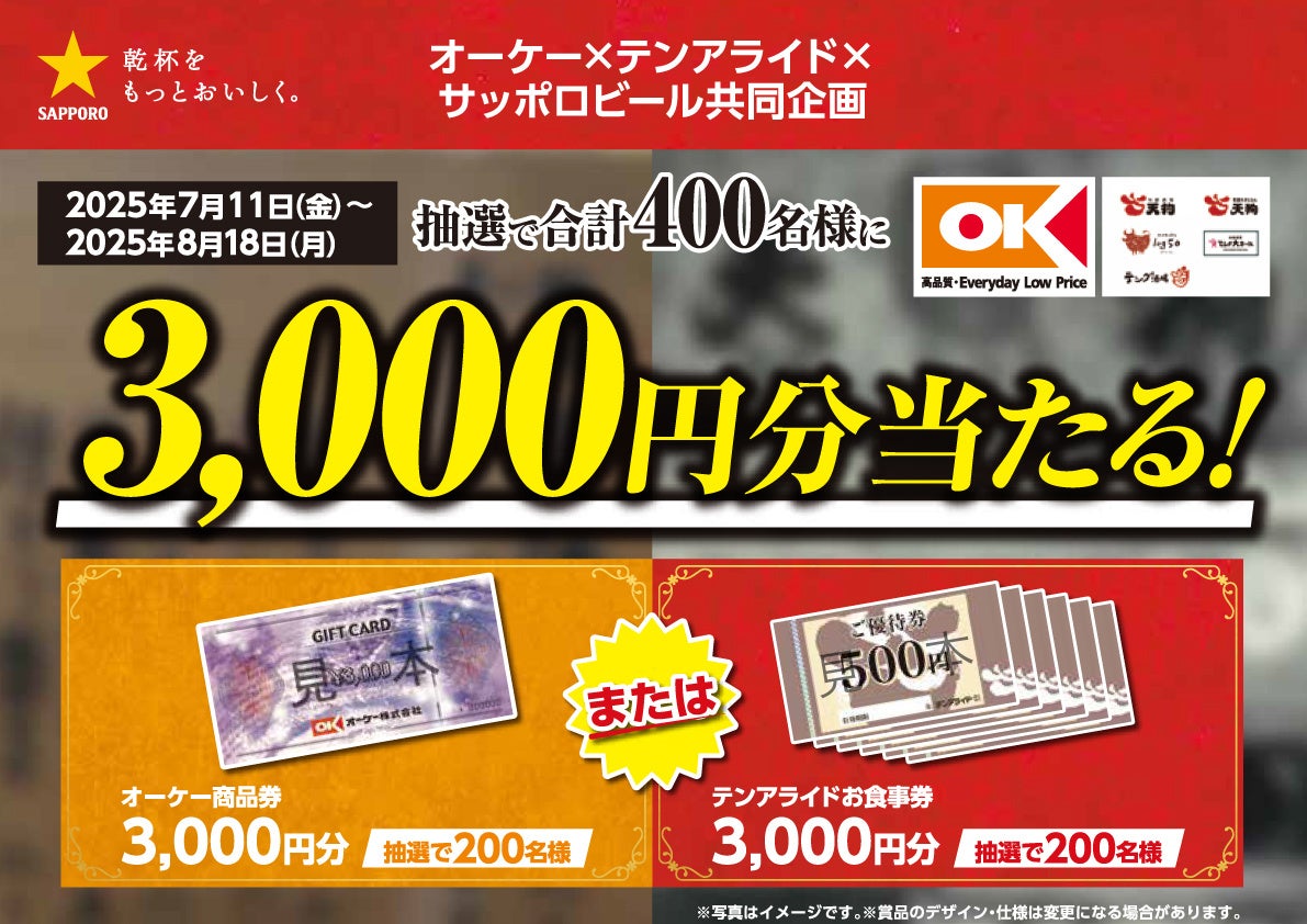 キャンペーン期間は、2025年7月11日(金)~8月18日(月)の約1か月間。対象店舗はテンアライドが展開する「旬鮮酒場天狗」「和食れすとらん天狗」「テング酒場」「てんぐ大ホール」「ミートキッチンlog50」またはオーケー全店舗で対象商品をご注文、もしくはお買い物でご応募いただくと、抽選で各200名様(合計400名様)に「テンアライドお食事券3,000円分」または「オーケー商品券3,000円分」をプレゼントいたします。
