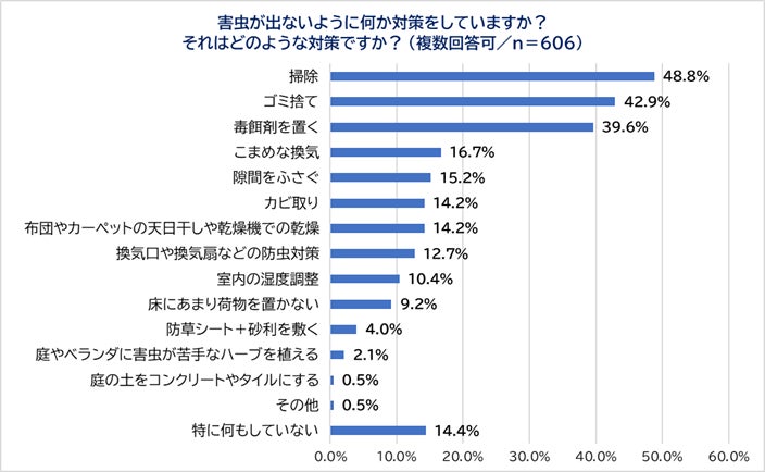 害虫が自宅に出る人は何か対策をしているのでしょうか?最も多かった対策は「掃除」(48.8%)、続いて「ゴミ捨て」(42.9%)、「毒餌剤を置く」(39.6%)、「こまめな換気」(16.7%)、「隙間をふさぐ」(15.2%)となりました。また、「特に何もしていない」も14.4%いました。