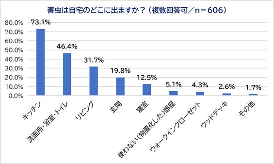 「たまに出る」または「よく出る」と回答した人に「害虫は自宅のどこに出るか」尋ねました。7割以上が「キッチン」(73.1%)と回答し最多で、以下、「洗面所・浴室・トイレ」(46.4%)、「リビング」(31.7%)、「玄関」(19.8%)、「寝室」(12.5%)と続きました。