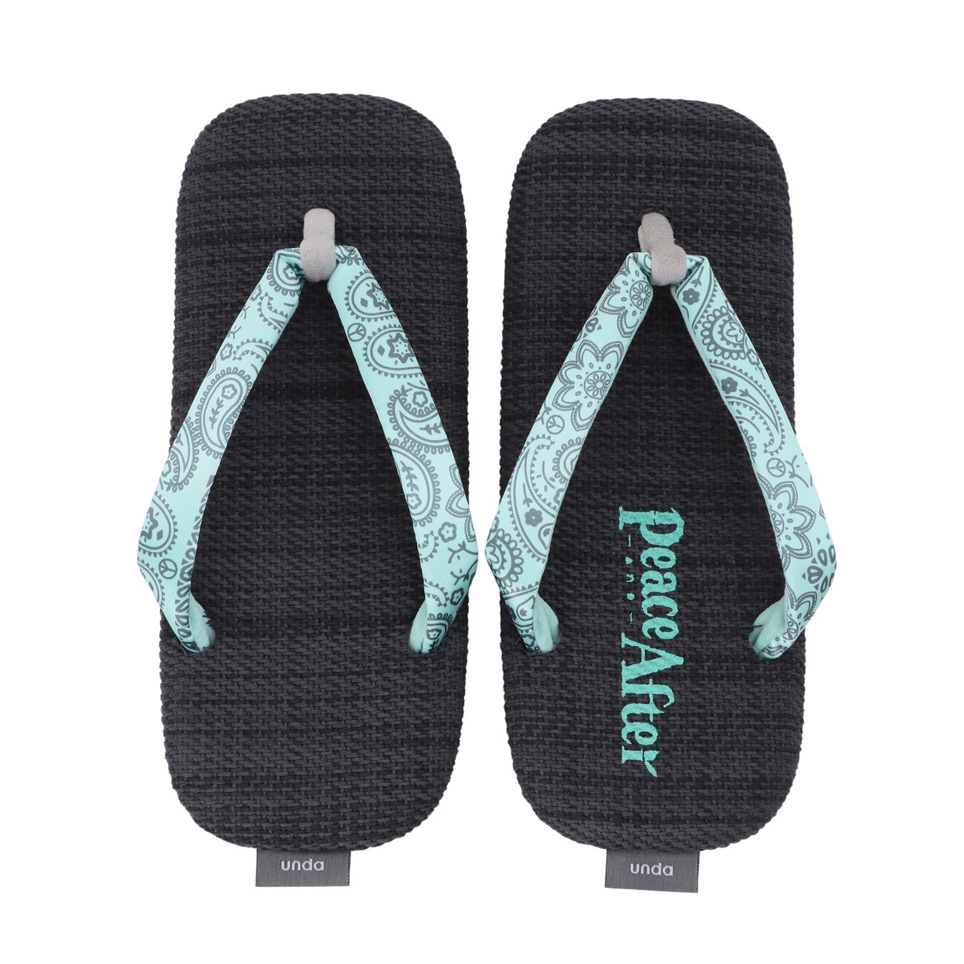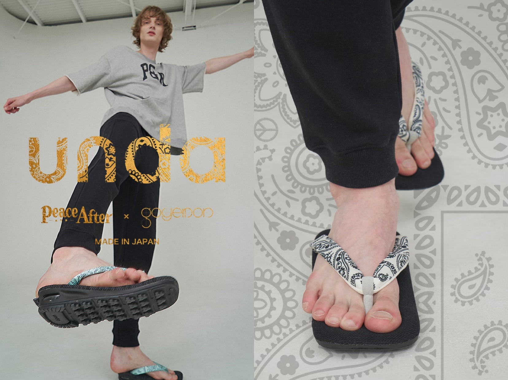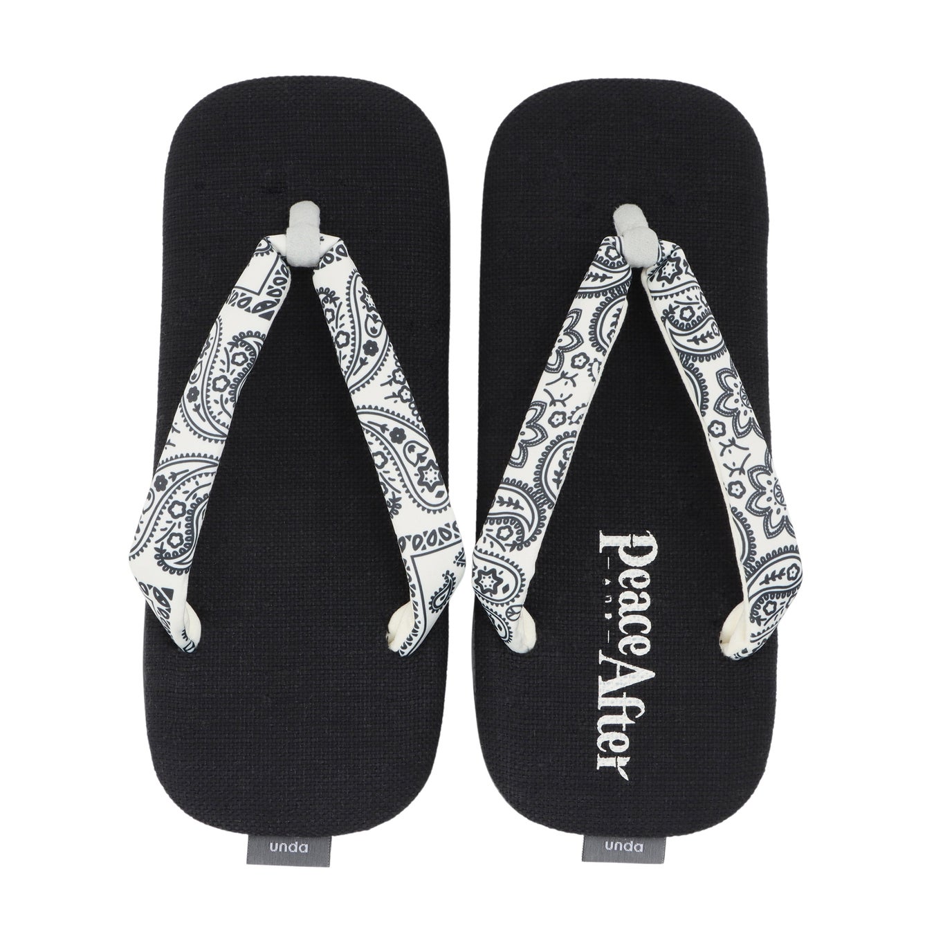goyemonが手掛ける、雪駄とスニーカーを掛け合わせた全く新しい独自の履物「unda-雲駄-」の鼻緒にペイズリー柄を施すことで、Peace and Afterらしい遊び心と個性をプラス。ソールにはundaの特徴であるエアーソールが入ることにより、素足にも肌馴染みが良く、雲の上を歩いているような履き心地となります。