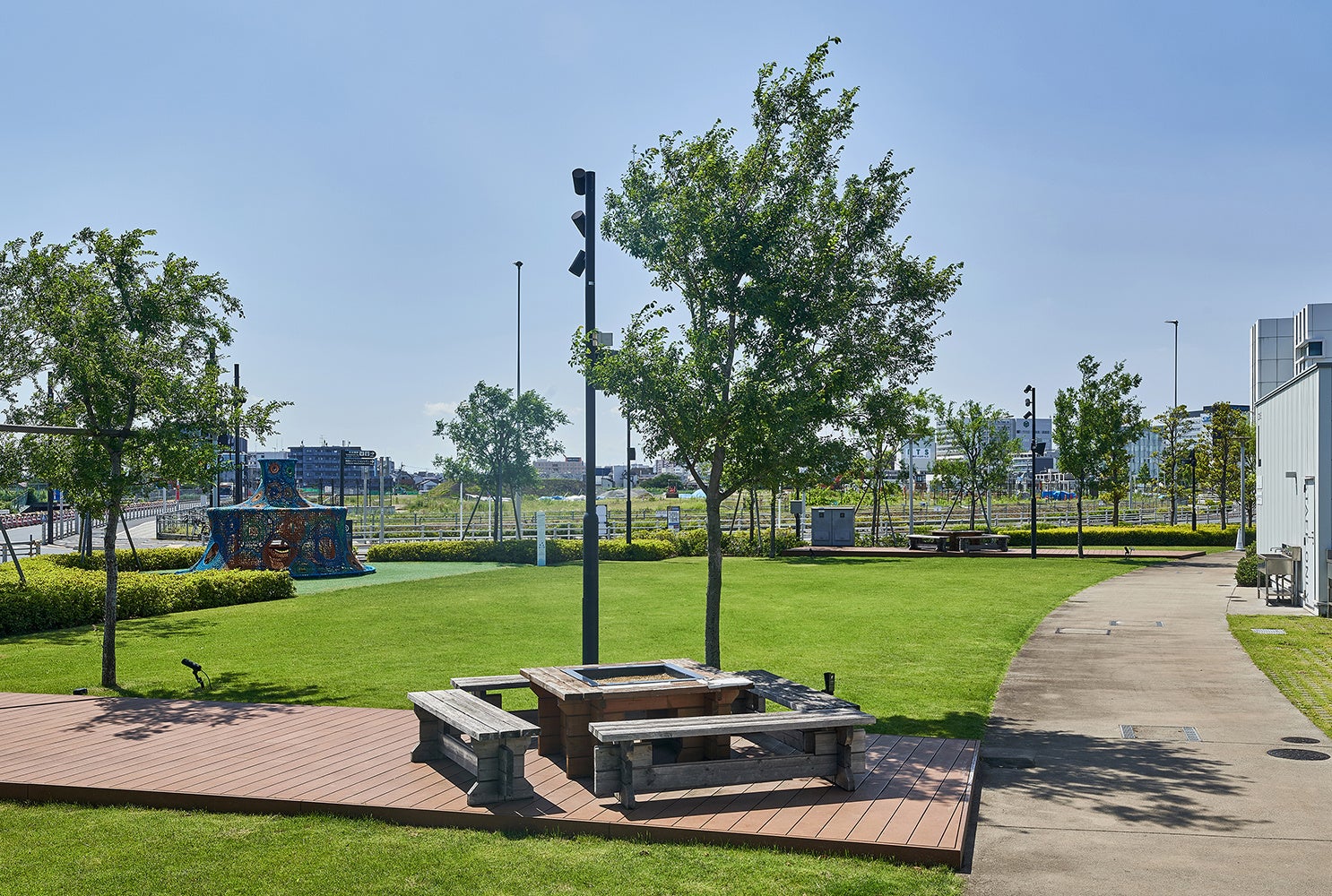 アート遊具が配置された芝生広場。大空や風を感じながらアートと過ごすことができる空間。音楽イベントやスポーツイベントにも活用可能です。