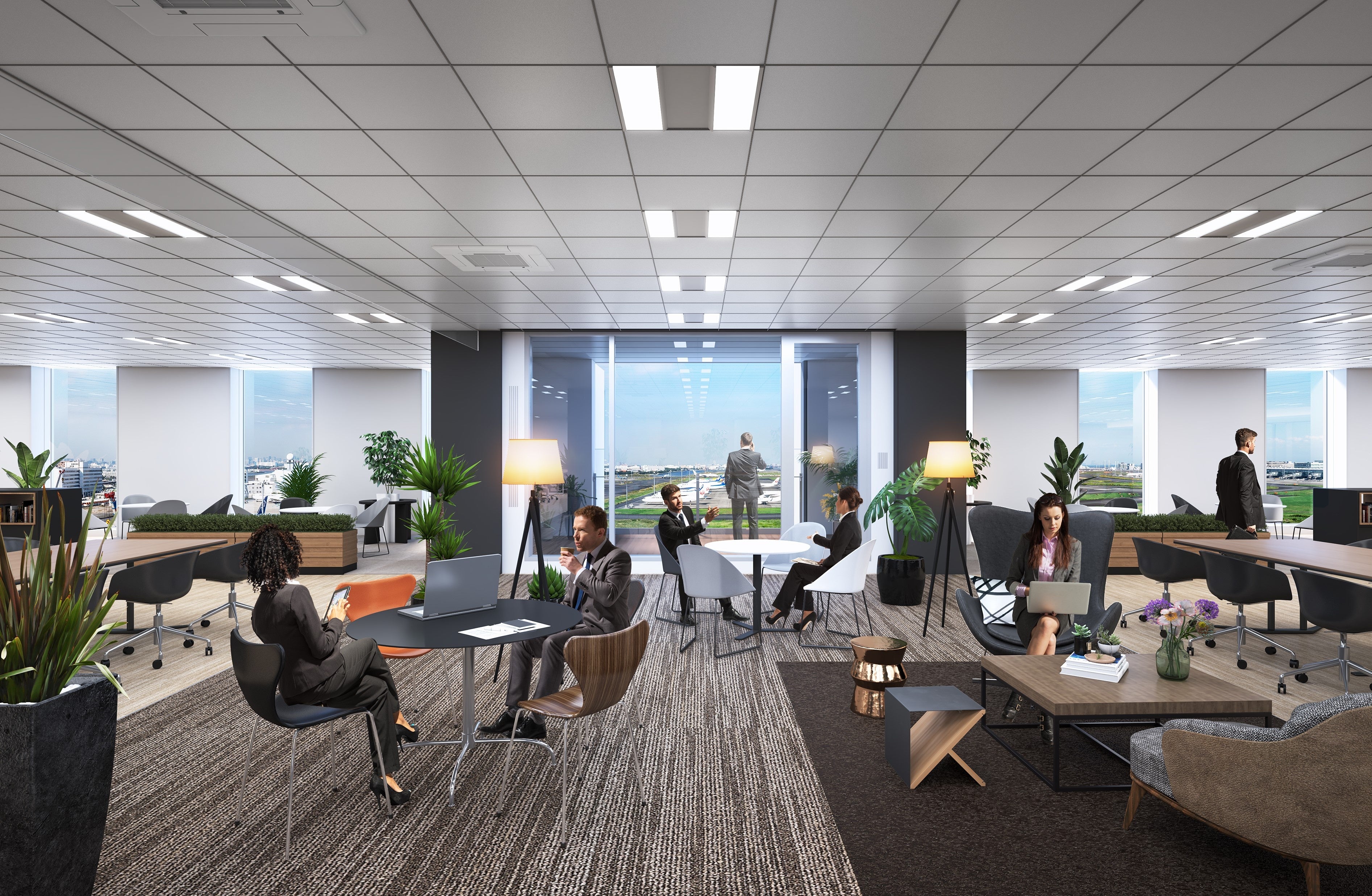 基準階は1,700坪超え、最大8分割に対応可能なフロアプレート。各階南北2ヵ所に外気を感じられる専用バルコニーを有しています。共用部には、リフレッシュコーナー、パントリー等の配置、空港や富士山が望めるオフィス専用の屋上デッキも設けるなど、オフィスワーカーの利便性・多様性に配慮しています。