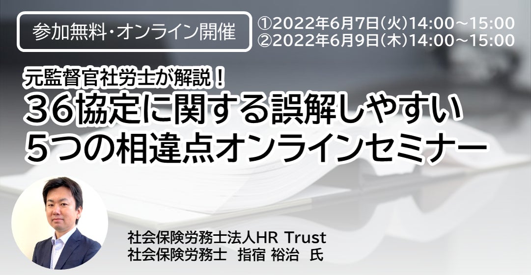 経営者、人事労務責任者必見!「元監督官社労士が解説!36協定に関する誤解しやすい5つの相違点オンラインセミナー」を、2022年6月7日(火)と9日(木)の14時からオンラインで開催いたします。両日同じ内容のため、ご都合の良い方にご参加ください。