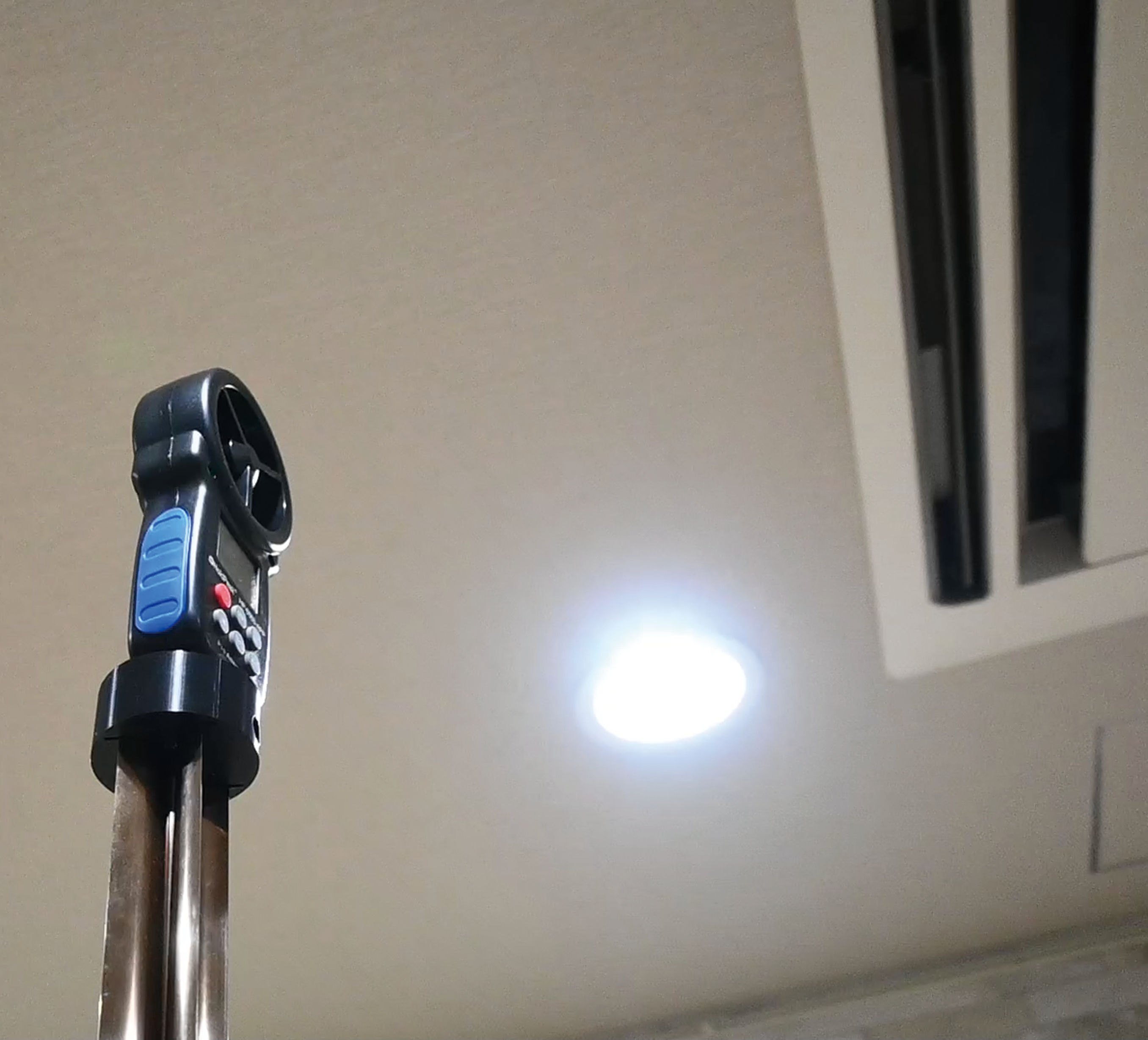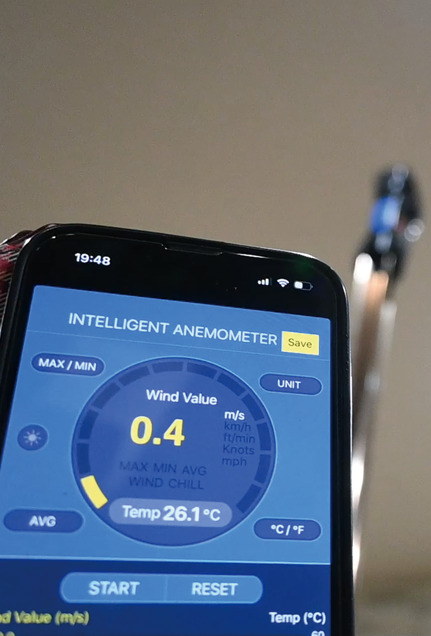 <BambooShoot Actuator に風速・風量計を装着(上)、手元のスマホで測定(下)>