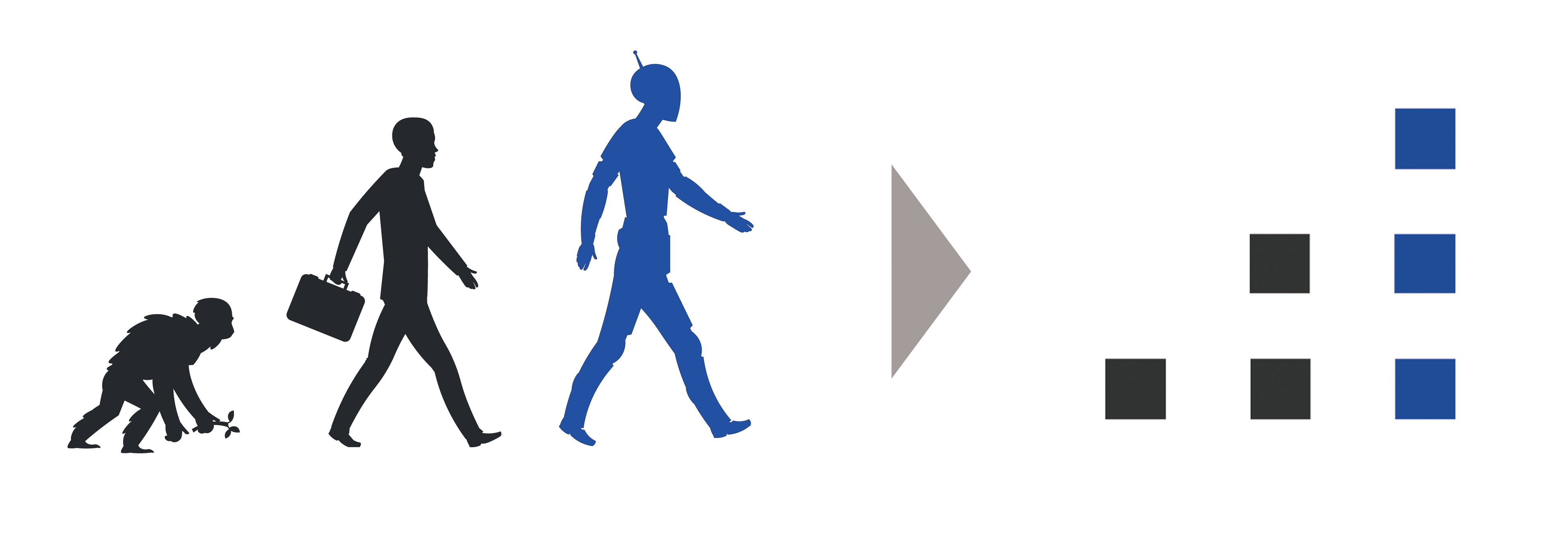 会社ロゴの右の点は、黒が猿から人、青がロボットを示し、サルからヒトへの進化を示した図から長尾が発想しました。イラストで表現すると、下のイラストのようなイメージです。