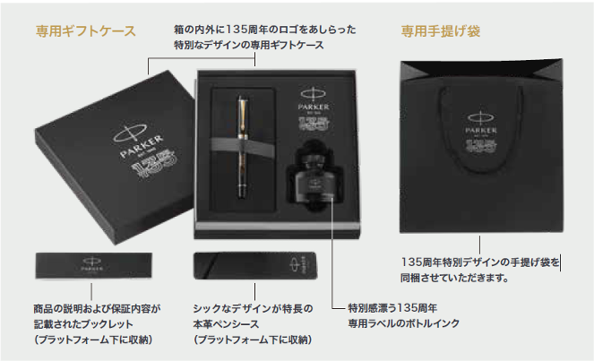 本体価格5,000円(5,500円(税込))以上のパーカー製品をお買い上げの方に、135周年のスペシャルロゴがはいった「手提げ袋」と「オリジナルペンシース」を数量限定でプレゼントいたします。