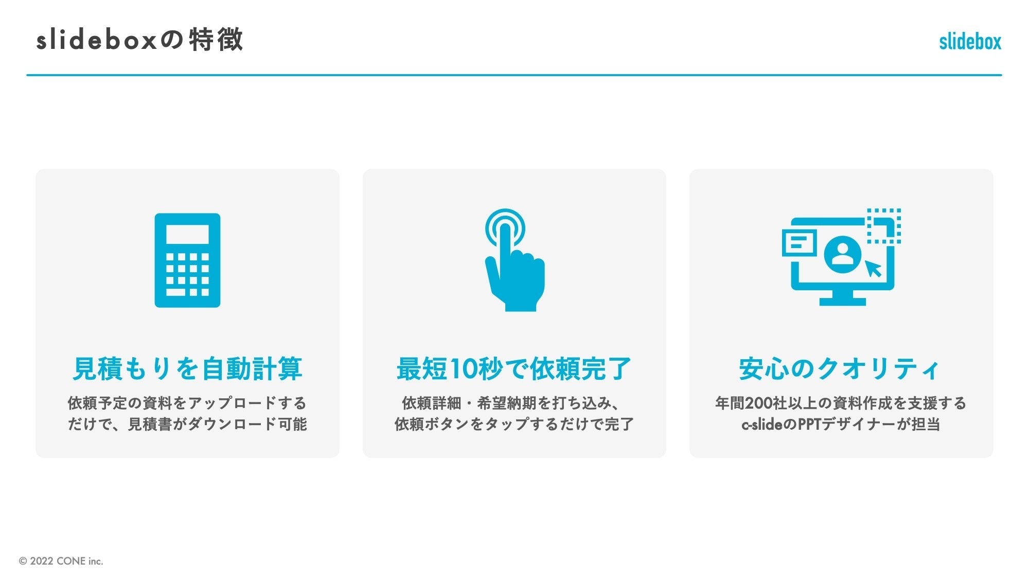 株式会社CONE(本社:大阪府大阪市、代表取締役:佐藤立樹)は、ボタンひとつで資料作成がかんたんに発注できるサービス「slidebox(スライドボックス)」(https://slidebox.jp/)を7月26日より公開いたします。元資料をアップロードして発注ボタンを押すだけで、希望納期までにリデザインされた資料が納品されるサービスです。