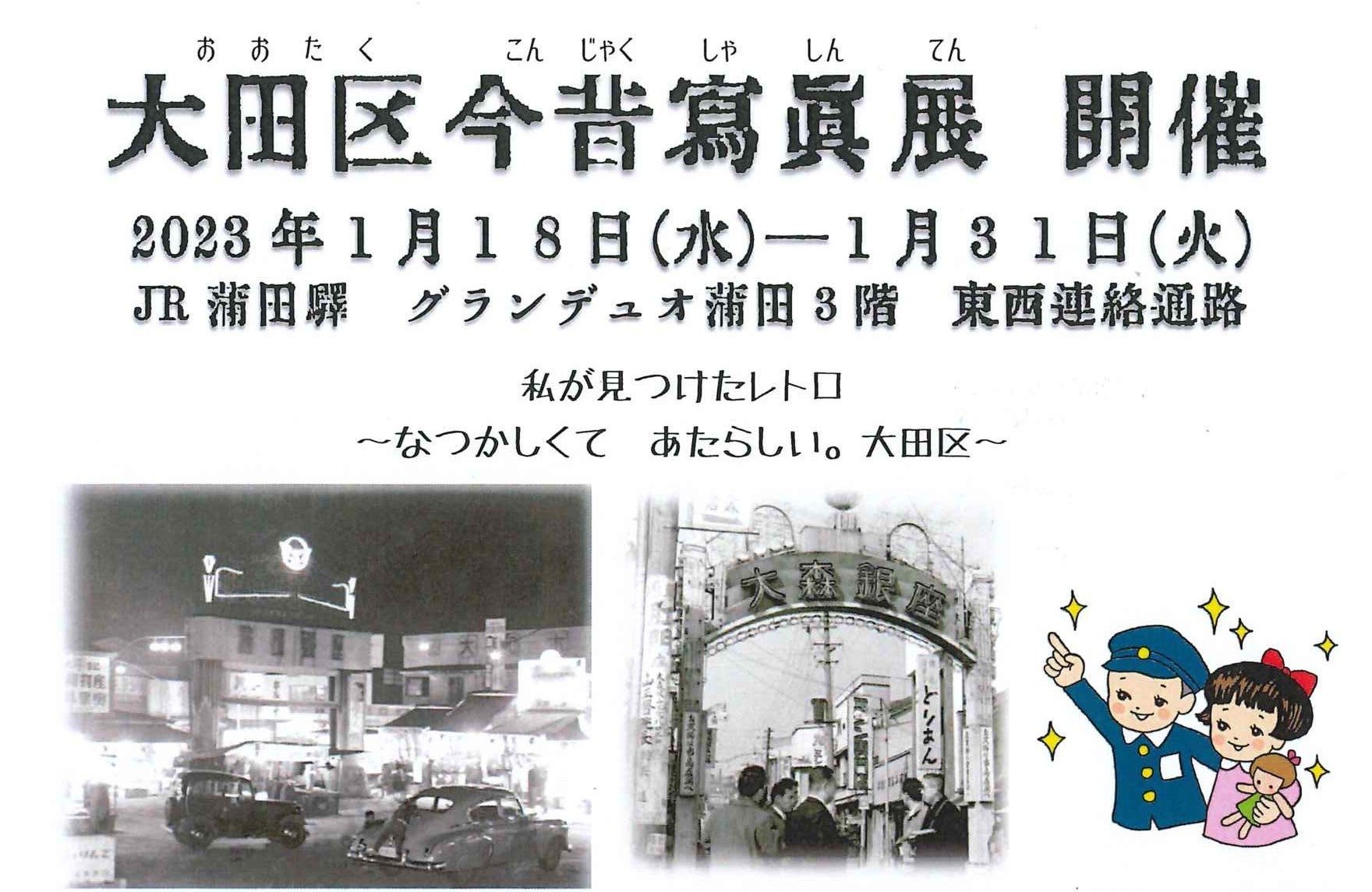 区立郷土博物館所蔵の写真を基とした「昔の商店街の景観パネル」、令和4年秋に開催したインスタグラム写真コンテスト「私が見つけたレトロ」入賞作品、蒲田今昔マップ等の展示、および東京都公認「ヘブンアーティスト」として活躍する「大道芸研究会」所属のアーティストによる昭和の物売り口上・紙芝居の実演により昭和の熱気や懐かしさを体感するとともに、世代を超えた共感性を生み出すことで、不確実性の高い現代を生き抜くヒントを得ていただくことを願い実施します。