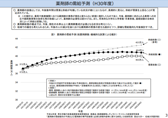 今後数年間は需要と供給が均衡している状態が続く、しかし長期的に見ると供給が需要を上回ることが見込まれる。厚生労働省 薬剤師の需給調査より引用