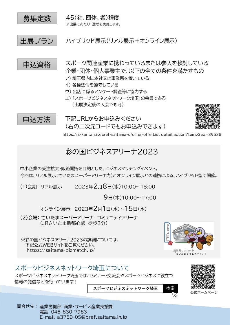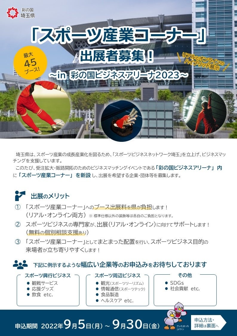 このたび、受注拡大・販路開拓のためのビジネスマッチングイベントである「彩の国ビジネスアリーナ2023」内に新設する「スポーツ産業コーナー」への出展企業等を募集することとしました。