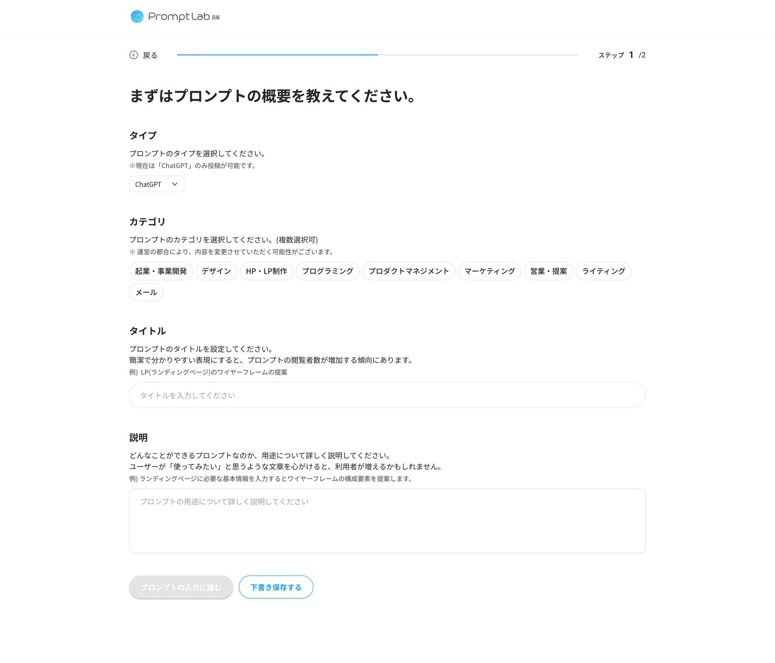 Promp tLab(プロンプトラボ)とは、AIプロンプトと呼ばれる「AIに適切な指示を出すための文章」を簡単に利用できるサービスです。必要項目を記入するだけで、面倒な作業を20秒程度でAIに片付けてもらうことができます。