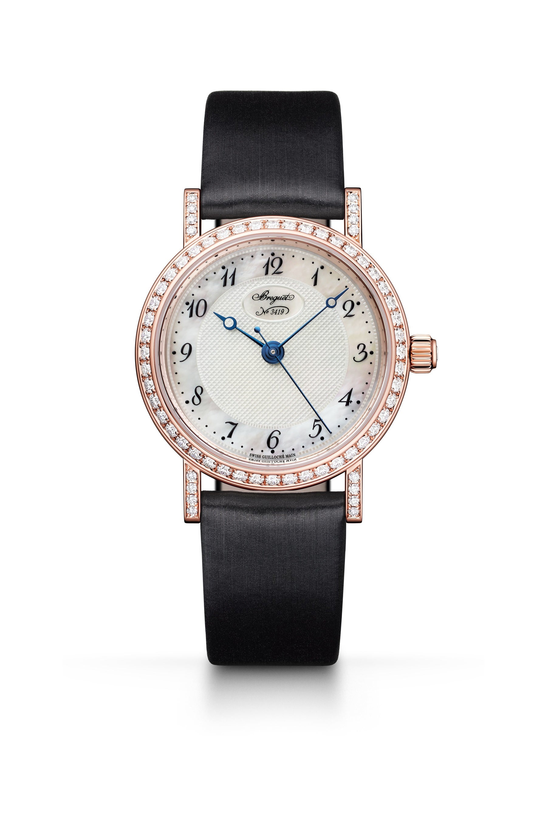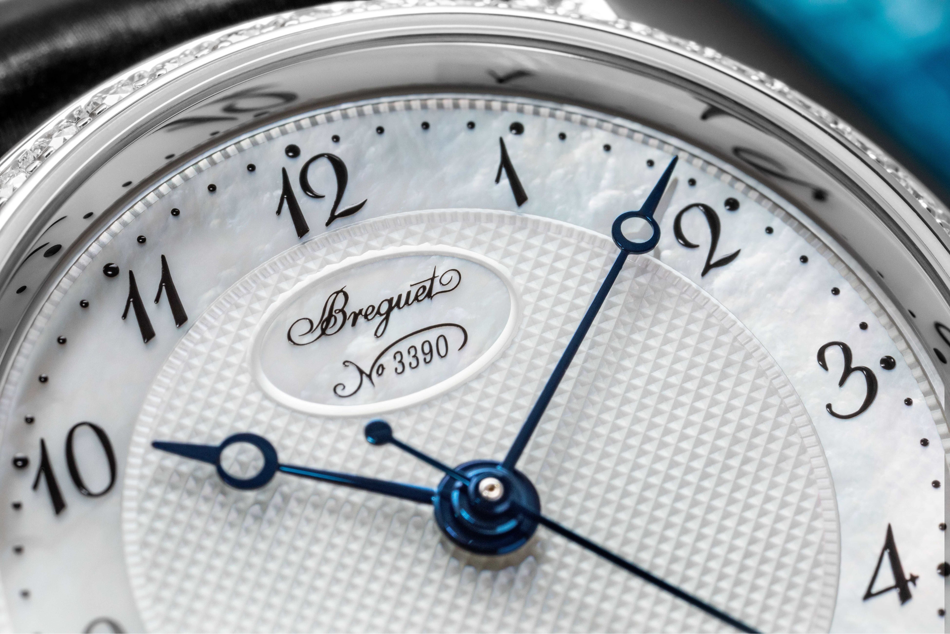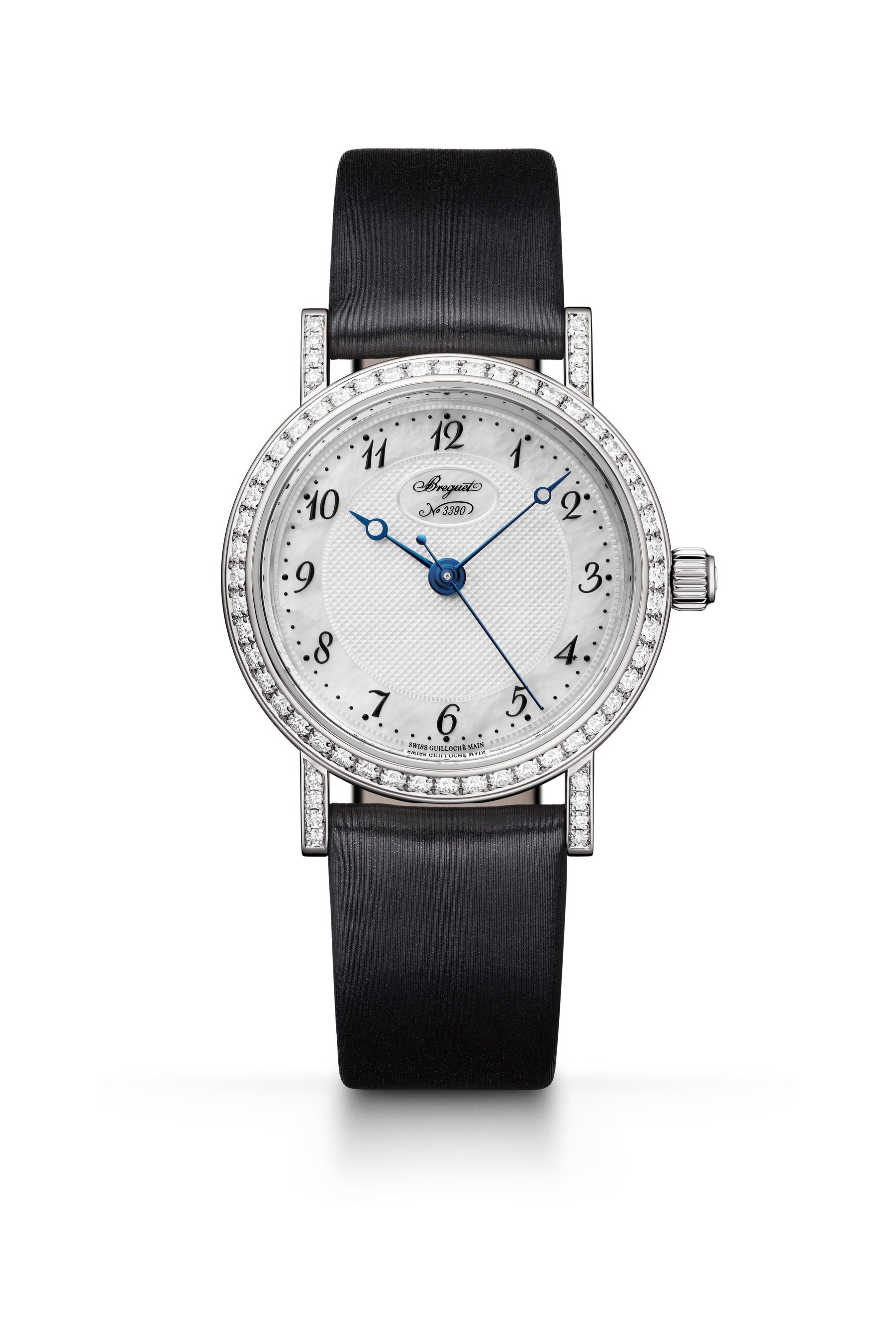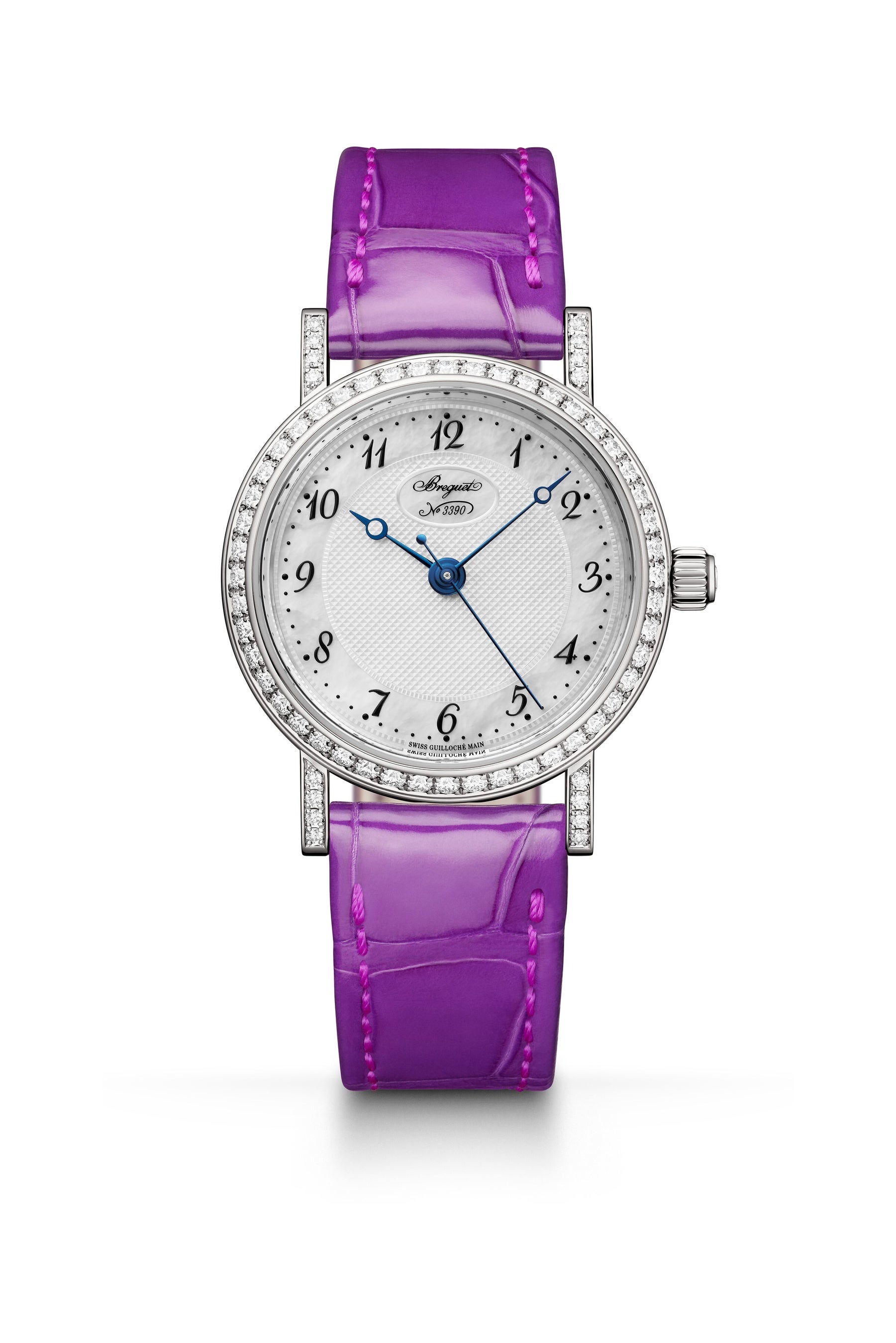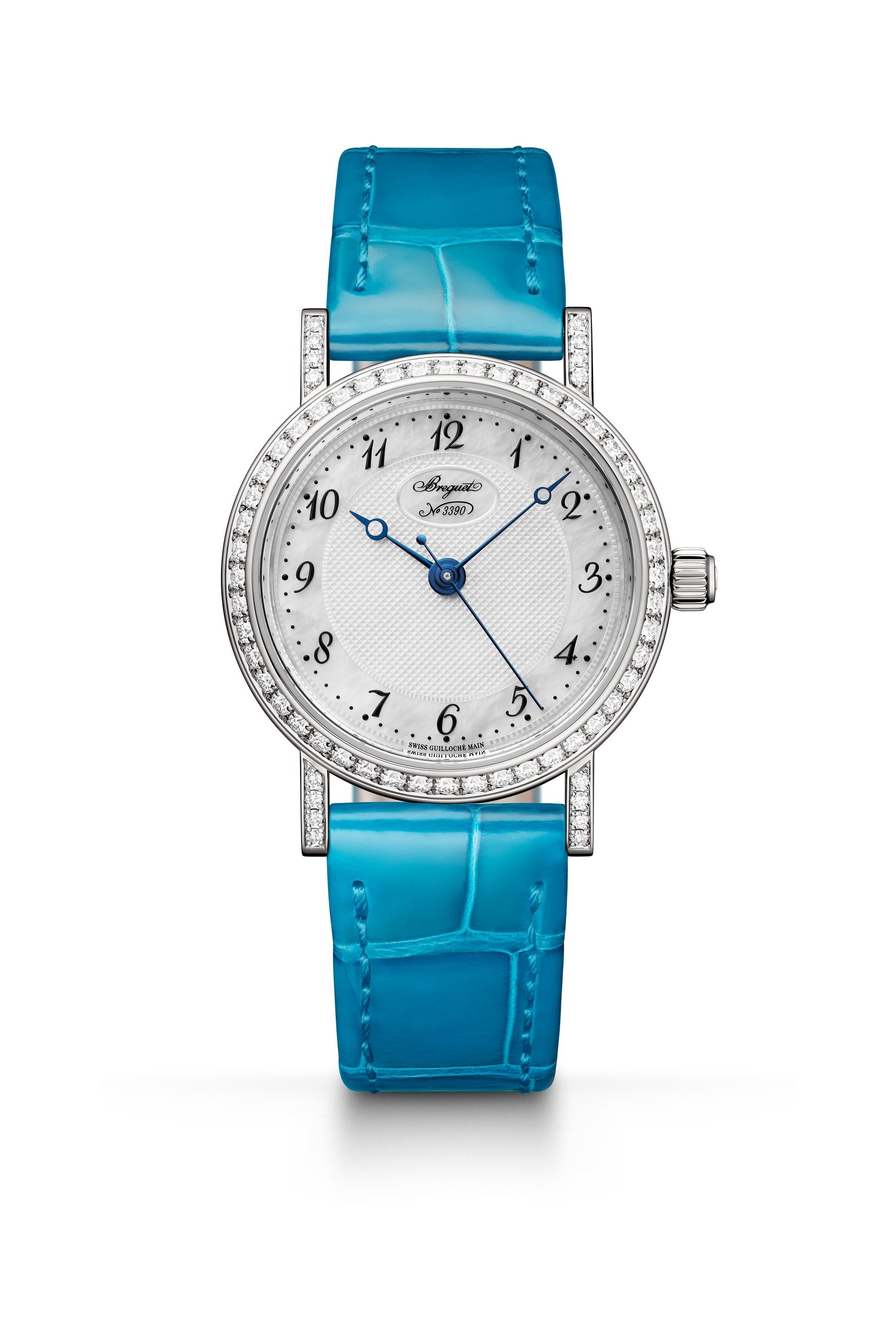 新しい「クラシック 8068」は、ストラップの付け替えによって時計のスタイルを変えられることに加え、モダンな感覚と洗練された味わいをブレンドしたニュールックも特徴です。もともとブルーサファイアがセットされていたリュウズには、今回カボションカットのダイヤモンドが用いられました。マザーオブパールのダイヤルは、ブレゲ・マニュファクチュールの職人が手作業で施した非常に繊細なギヨシェ彫りの模様によって装飾されています。さらに、フェイスに軽快なタッチをもたらすために、チャプターリングのインデックスとしてブレゲ特有のアラビア数字が用いられました。そして、12時位置にブランドのロゴを据えた小さな楕円モチーフが控え目に置かれています。