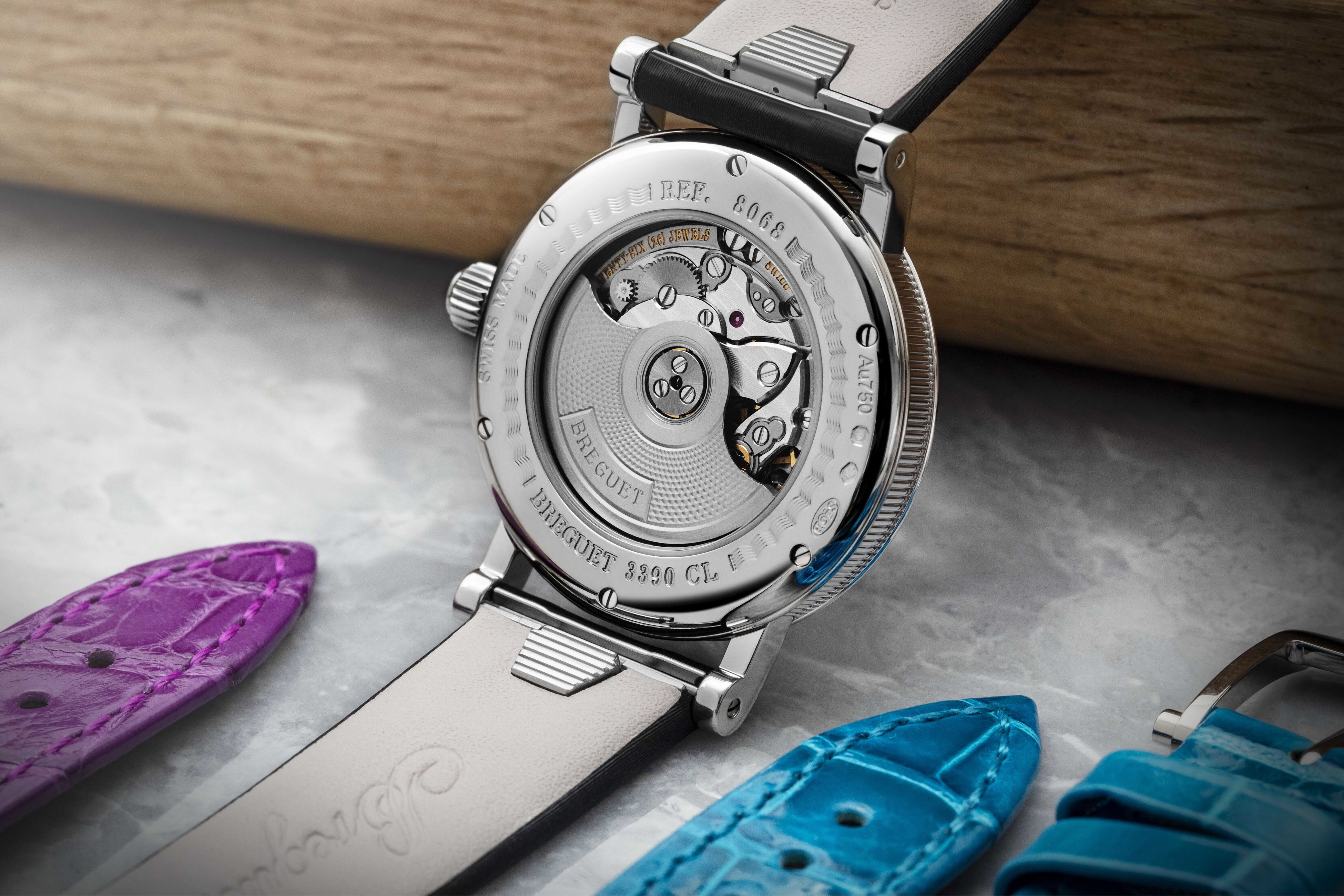 ムーブメントはまた、インライン・スイスレバー脱進機とシリコン製ひげゼンマイを装備しています。このシリコン素材には、腐食や損耗への耐性に加え、磁場の影響を受けないなど、数多くの優れた性質があり、時計の精度向上に貢献します。3気圧(30m)防水のケース裏面からは、サファイア・ケースバックを通じて、さまざまな部品に施された面取りやコート・ド・ジュネーブ模様など、ブレゲが大切にする技術のひとつに数えられる装飾仕上げが鑑賞できます。