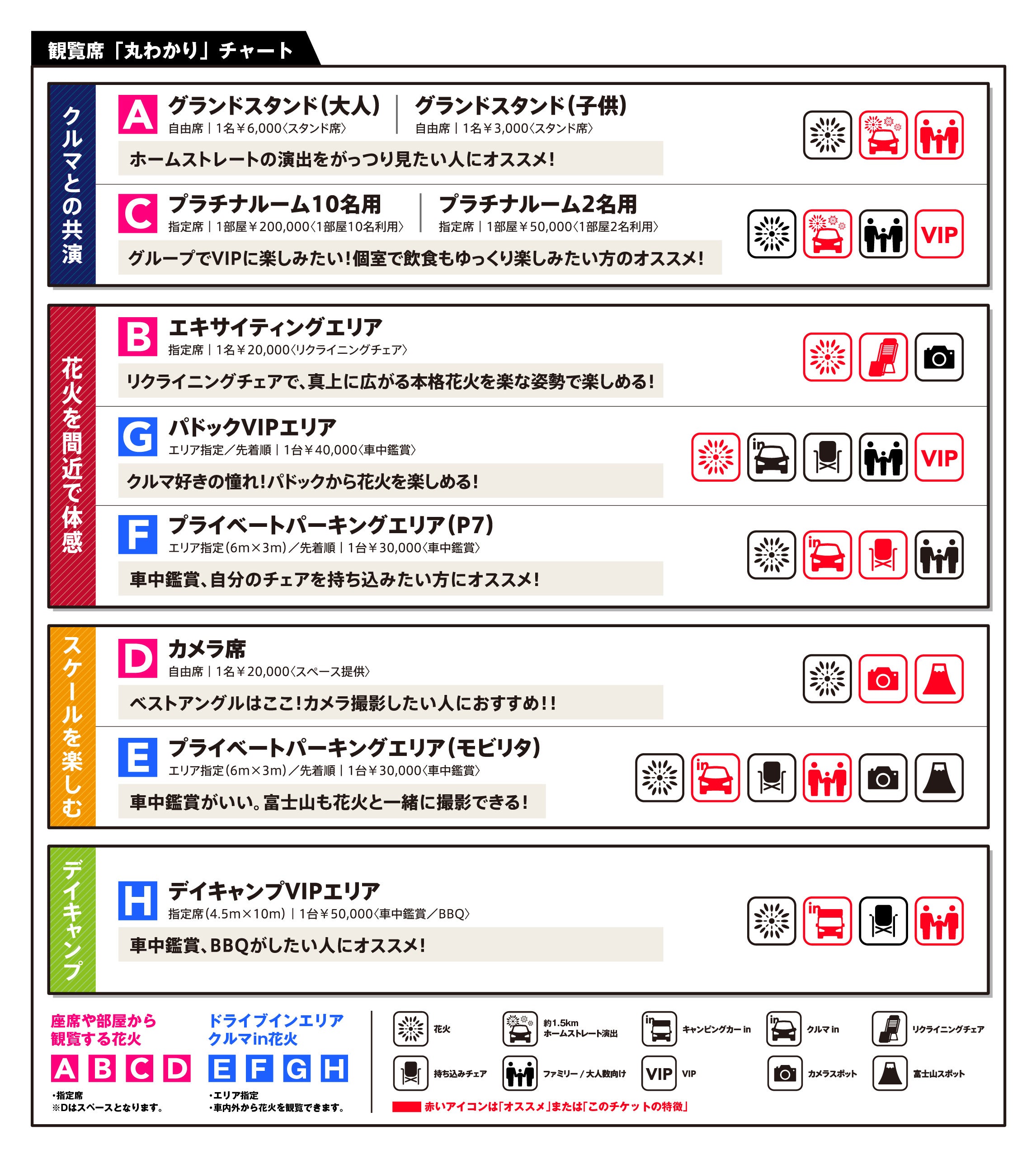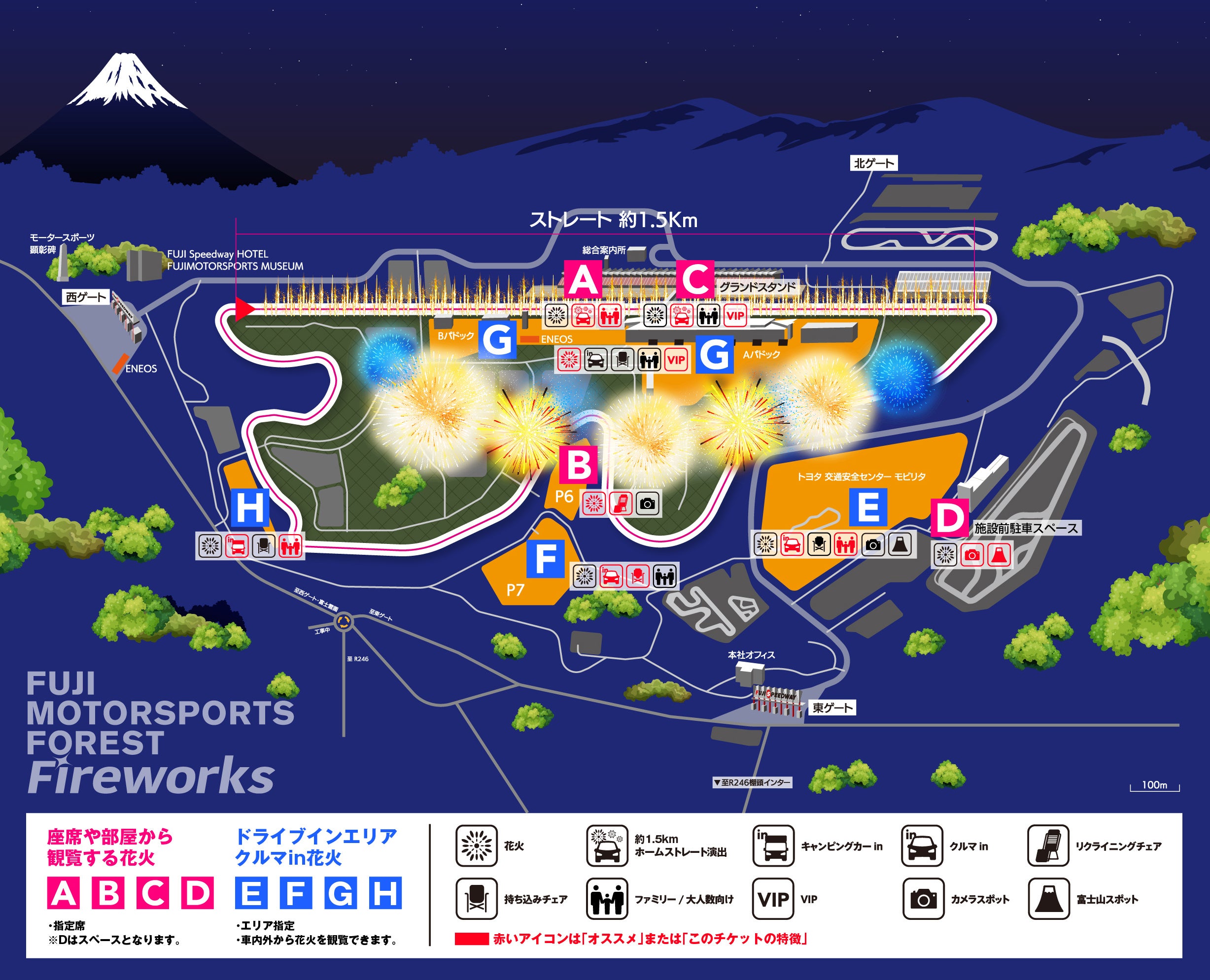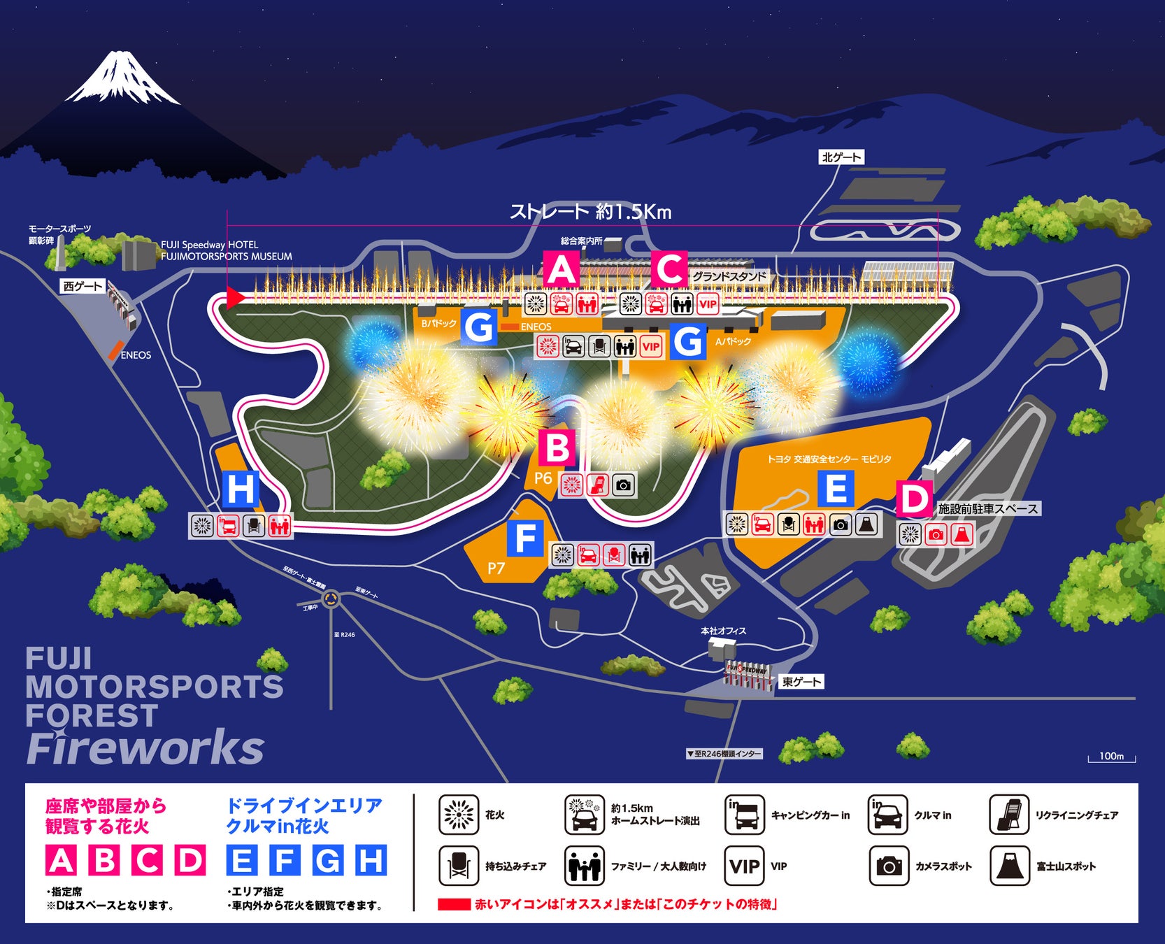 また、約1.5kmのホームストレートを一望出来るエリアでもあるため、ホームストレート上で行われる花火とクルマの共演はもちろんのこと、富士スピードウェイ全体を使って打ち上げる花火も大変よく見えるお席です。