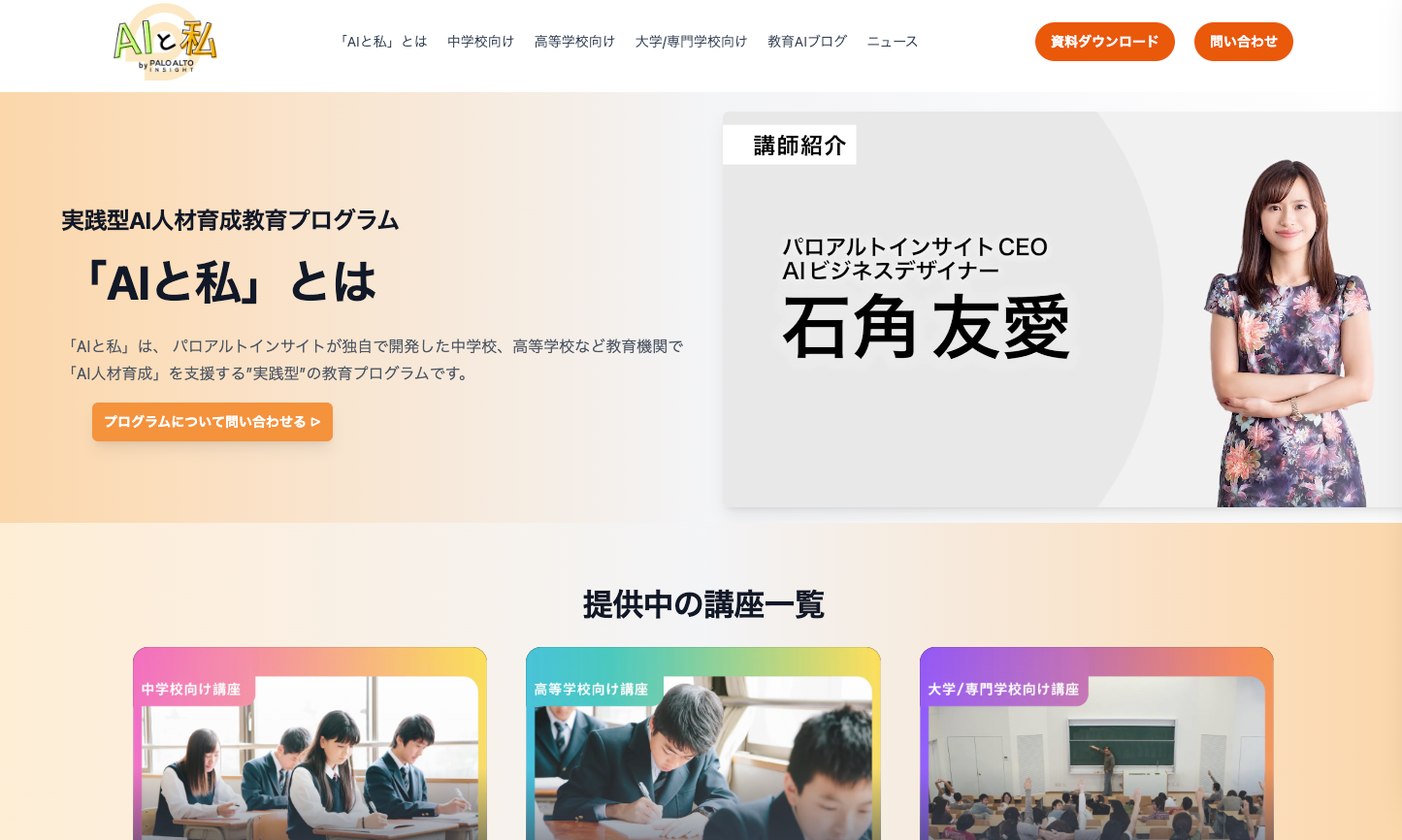 このカリキュラムは、パロアルトインサイトCEO石角友愛(いしずみ・ともえ)、同CTO長谷川貴久(はせがわ・たかひさ)が講師を務める完全オンラインの講座です。プログラミングスクールのようにAIの技術的な側面を学ぶだけでなく、「なぜ、私がAIを学ぶことに意味があるのか」という本質的な部分にフォーカスを当て、社会問題解決に使われるAI事例や、ビジネス現場へのAI導入事例などを交えて、座学ではなくプロジェクトベースで生徒にAIの技術やビジネス応用の理解、さらには国際的なジェンダー感覚や倫理観の醸成を促す内容となっています。