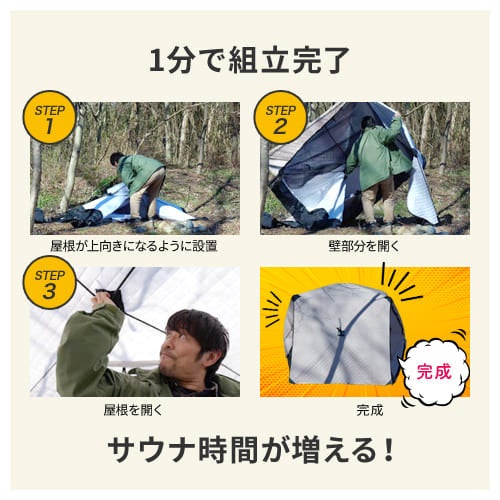 従来テントが組立に約10分かかるのに対し、約1分で組み立て完了です。その分、多くの時間を使えるのでサウナを満喫できます。