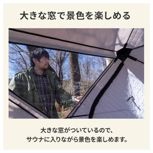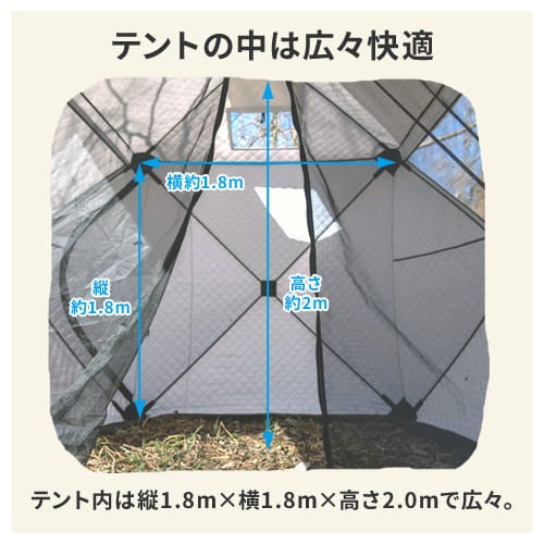 テント内は縦1.8m×横1.8m×高さ2.0mで広々。圧迫感もなく、十分なスペースでサウナを満喫できます。