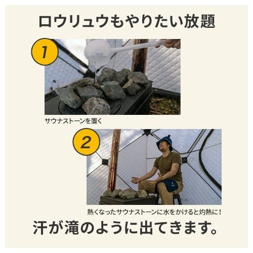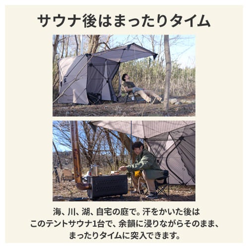 海、川、湖、自宅の庭で。汗をかいた後はこのテントサウナ1台で、余韻に浸りながらそのまま、まったりタイムに突入できます。