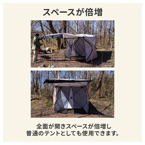 ・全面が開き、スペースが倍増し、普通のテントとしても使用可能。
