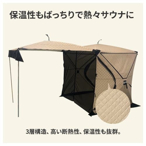 「Mad Sauna(マッドサウナ)」のテントサウナは3層構造で高い断熱性、保温性も抜群。熱々になるので汗が止まりません。