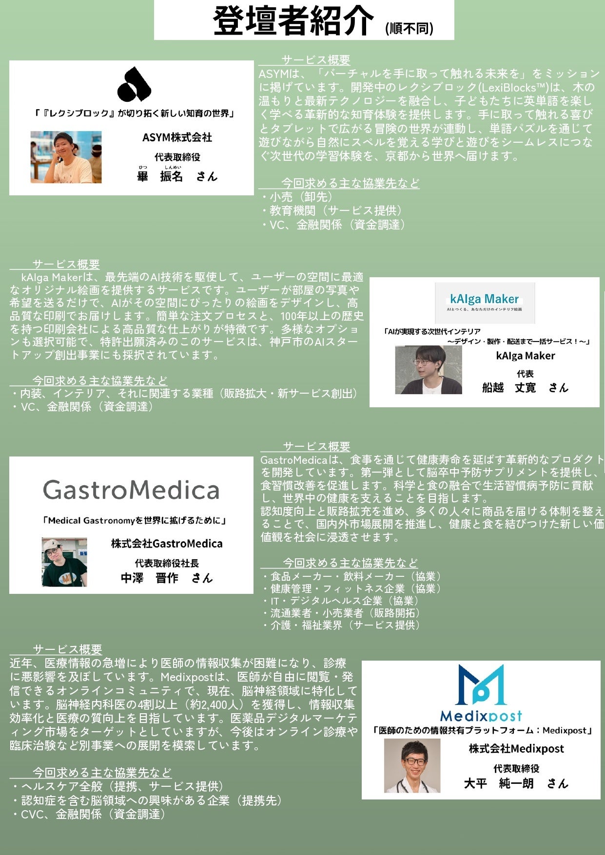 19回目の今回は、京都・大阪・神戸の若手起業家4名が登壇予定です。登壇企業との協業や、出資・融資をお考えの方、ぜひご参加ください。