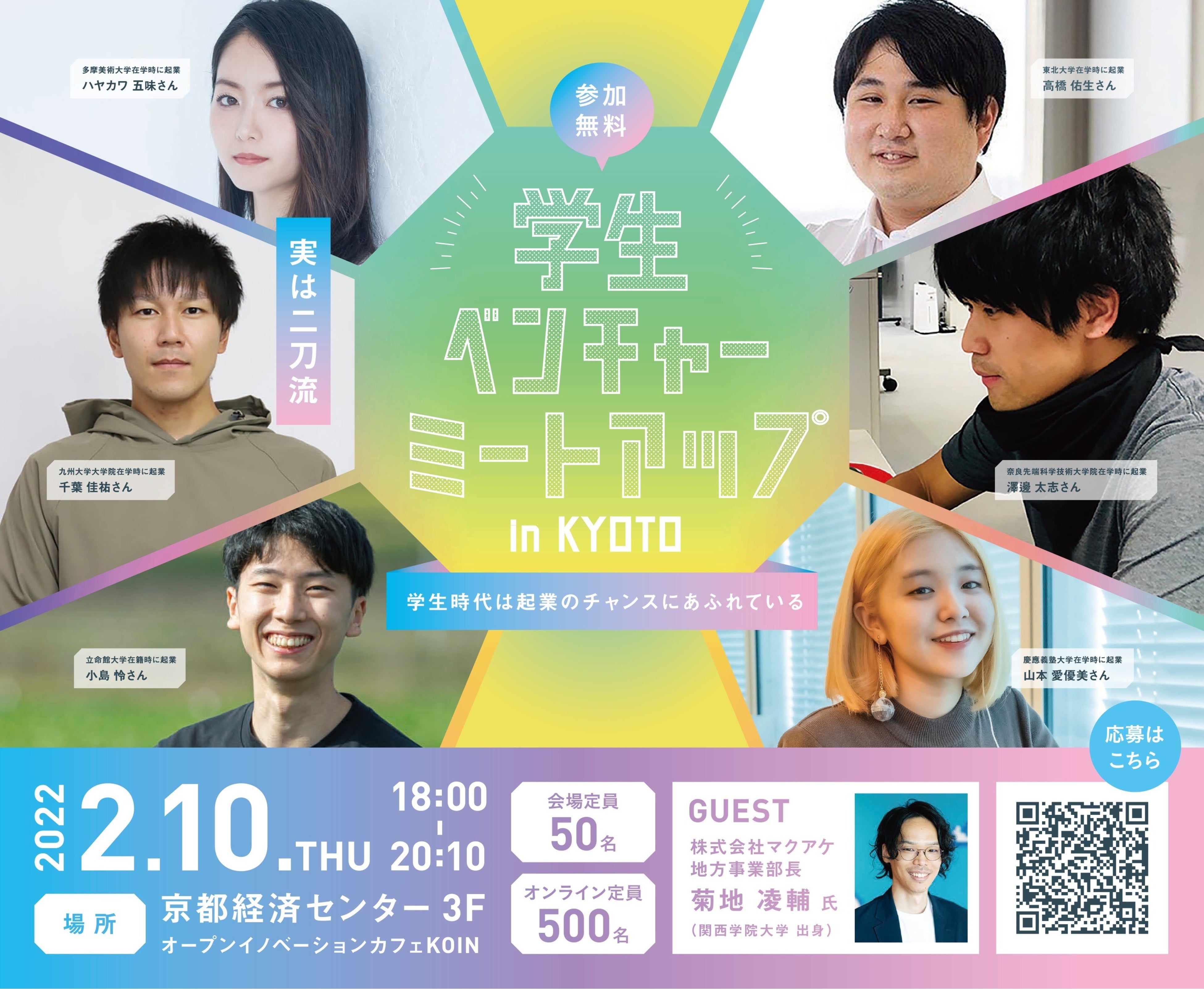 日本全国で学生時代に起業した6名が、自身の起業の経緯や事業への熱い想いを紹介します。またクラウドファンディング大手にて、さまざまな商品開発案件に携わってこられた株式会社マクアケの菊地凌輔地方事業部長をお迎えし、学生時代に起業した経験を踏まえ、「学生起業のすすめ―学生起業家からサラリーマンに。」と題して、お話いただきます。