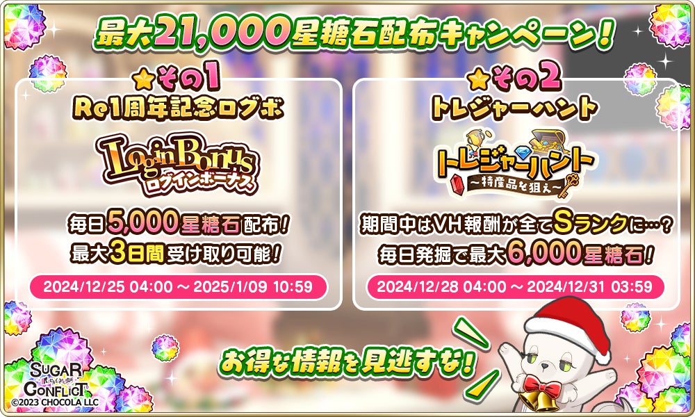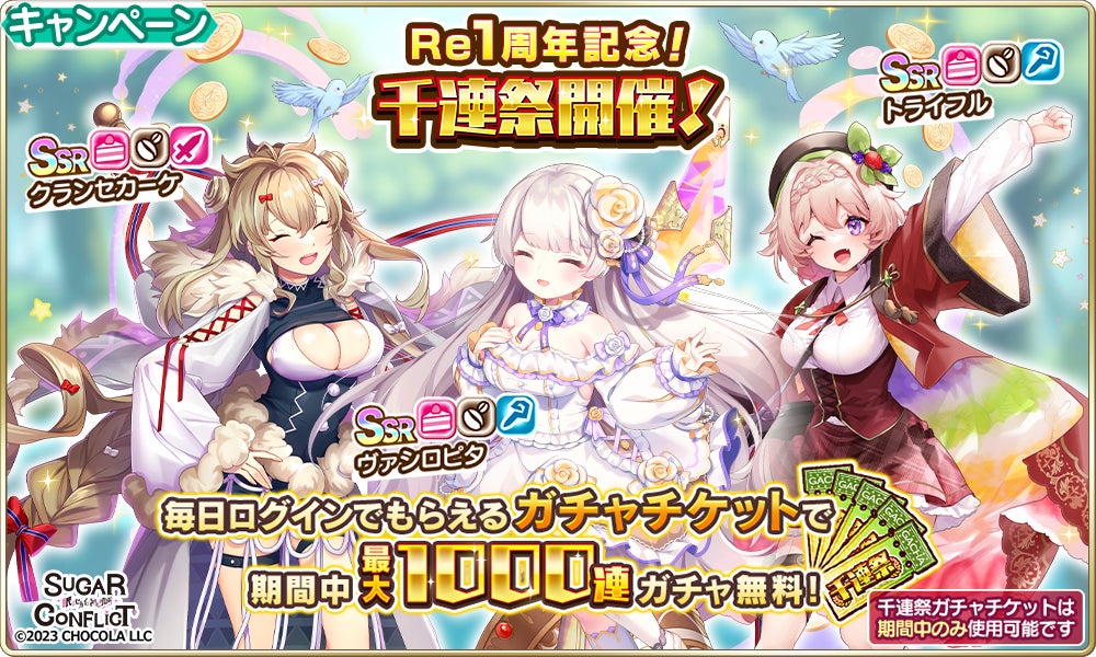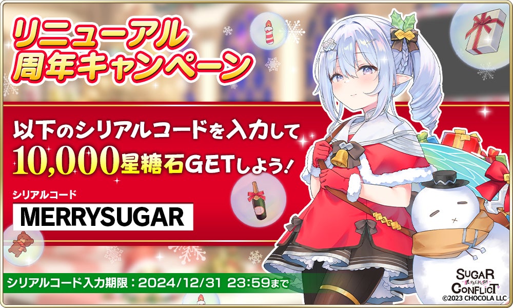 PCブラウザ・スマホアプリゲーム「シュガーコンフリクト -眠るセカイと神々の喰園-」を展開する合同会社ショコラ(本社:東京都港区)は、2024年12月25日(水)でリニューアルから1周年を迎えました!