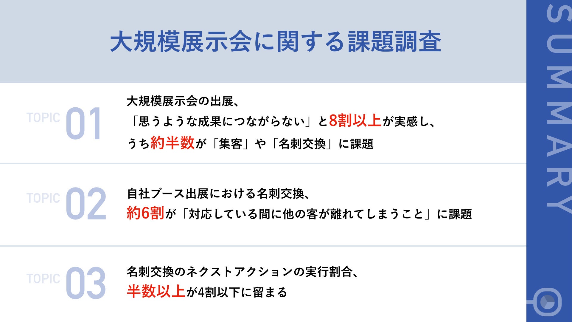 今回の調査では、大規模展示会への出展が思うような成果につながらず、「集客」や「名刺交換」に課題を抱えている企業が多いことが分かりました。また、名刺交換をした方に対してネクストアクションが実行できておらず、商談のチャンスを逃してしまっているケースも見受けられました。ネクストアクションを確実に実行することは、顧客獲得への近道であるといえます。効率的に来場者のフォローアップができる営業支援ツールを導入することは、スムーズな営業活動につながるのではないでしょうか。