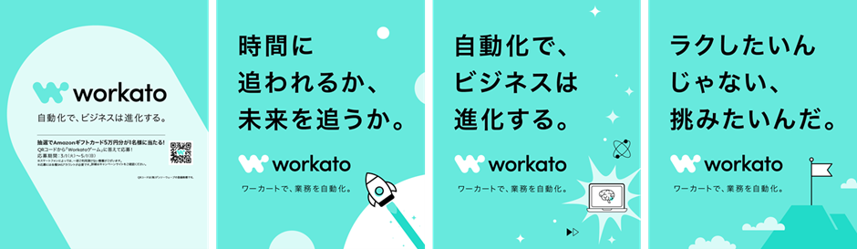 株式会社メルカリと横河電機株式会社のWorkato活用事例を動画でご紹介する他、Workatoのユニークなキャッチコピーを記した静止画広告も掲示します。また、3月1日より開始している、抽選でAmazonギフトカード5万円分が1名様に当たるキャンペーンを引き続き5月1日(日)まで実施します。
