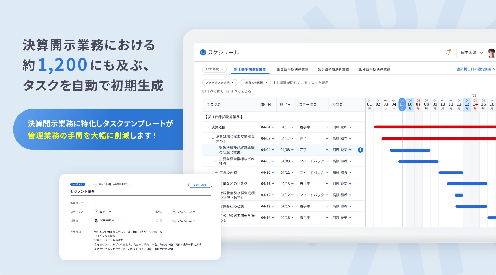 Uniforceは、膨大なタスクの管理や、複数部門に渡る担当者の進捗管理、煩雑なチェック業務などで生じる「遅延リスク・属人化リスク」を無くし、業務効率化を実現する、全く新しい決算開示に特化した業務管理サービスです。