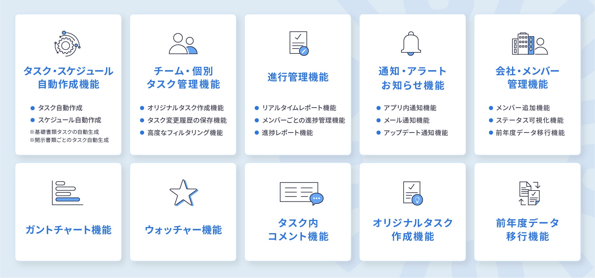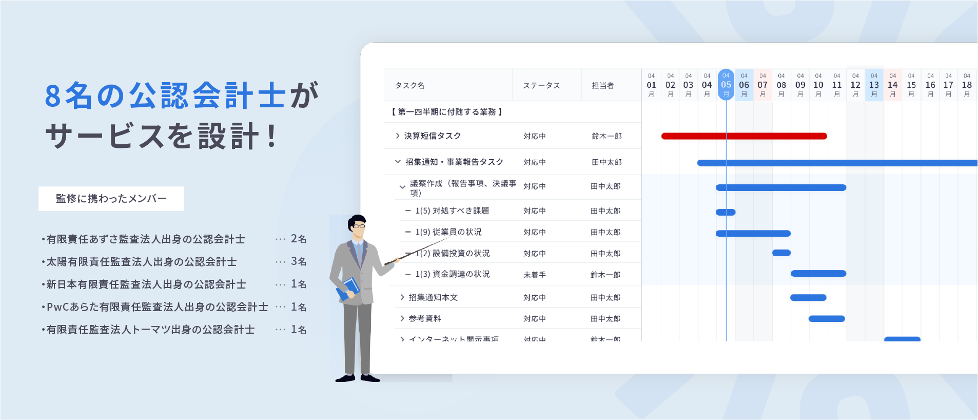 8名の公認会計士が作成したタスクリストと、スケジュールが自動生成されます。面倒なタスク作成と納期設定は必要なく、管理業務の手間を大幅に削減できます。