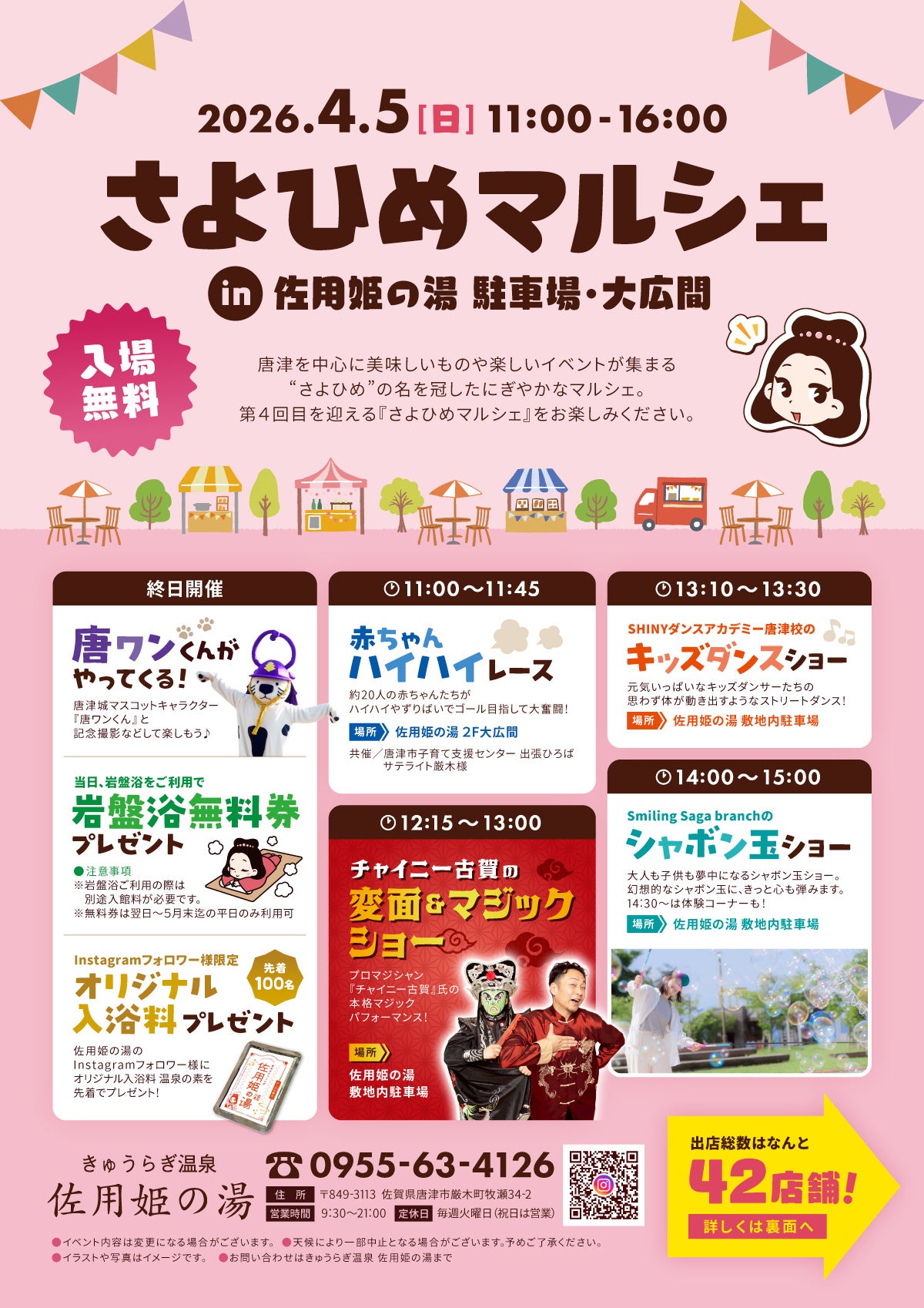 きゅうらぎ温泉 佐用姫の湯は、2026年4月5日(日)に「第4回 さよひめマルシェ」を開催します。2023年にスタートし今回で第4回目のマルシェは、例年1,000人以上が来場する地域イベントとして定着しており過去最多となる約40店舗が出店予定です。