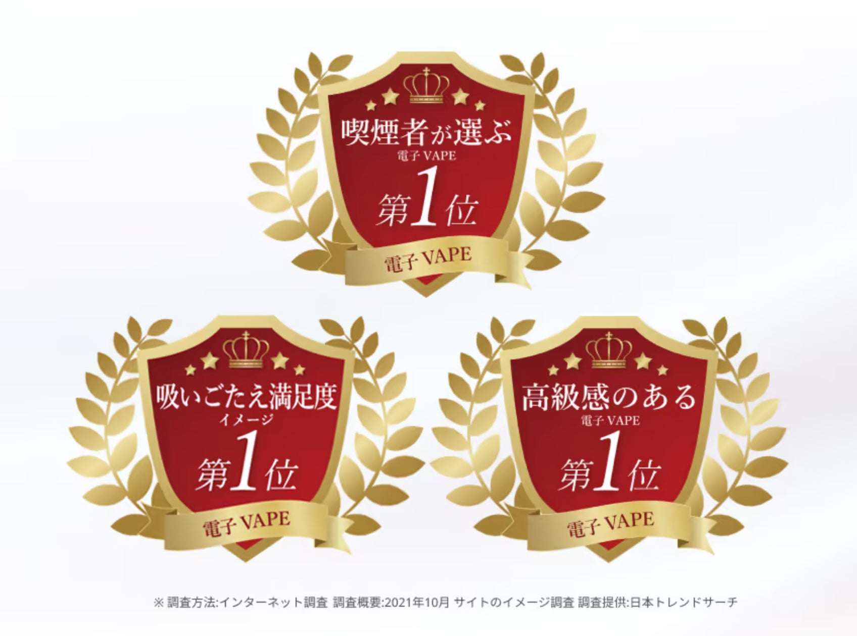 また、NONICO(ノニコ)はニコチン・タールゼロでありながら、独自技術により圧倒的な吸いごたえを実現し、日本トレンドリサーチによる計1,200名を対象としたアンケートでは、”吸いごたえイメージ”を含む以下の3冠を達成致しました。