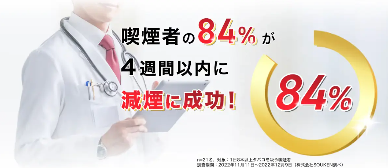 - 臨床試験にて「喫煙者の84%が4週間以内に減煙に成功」などの効果が立証!
