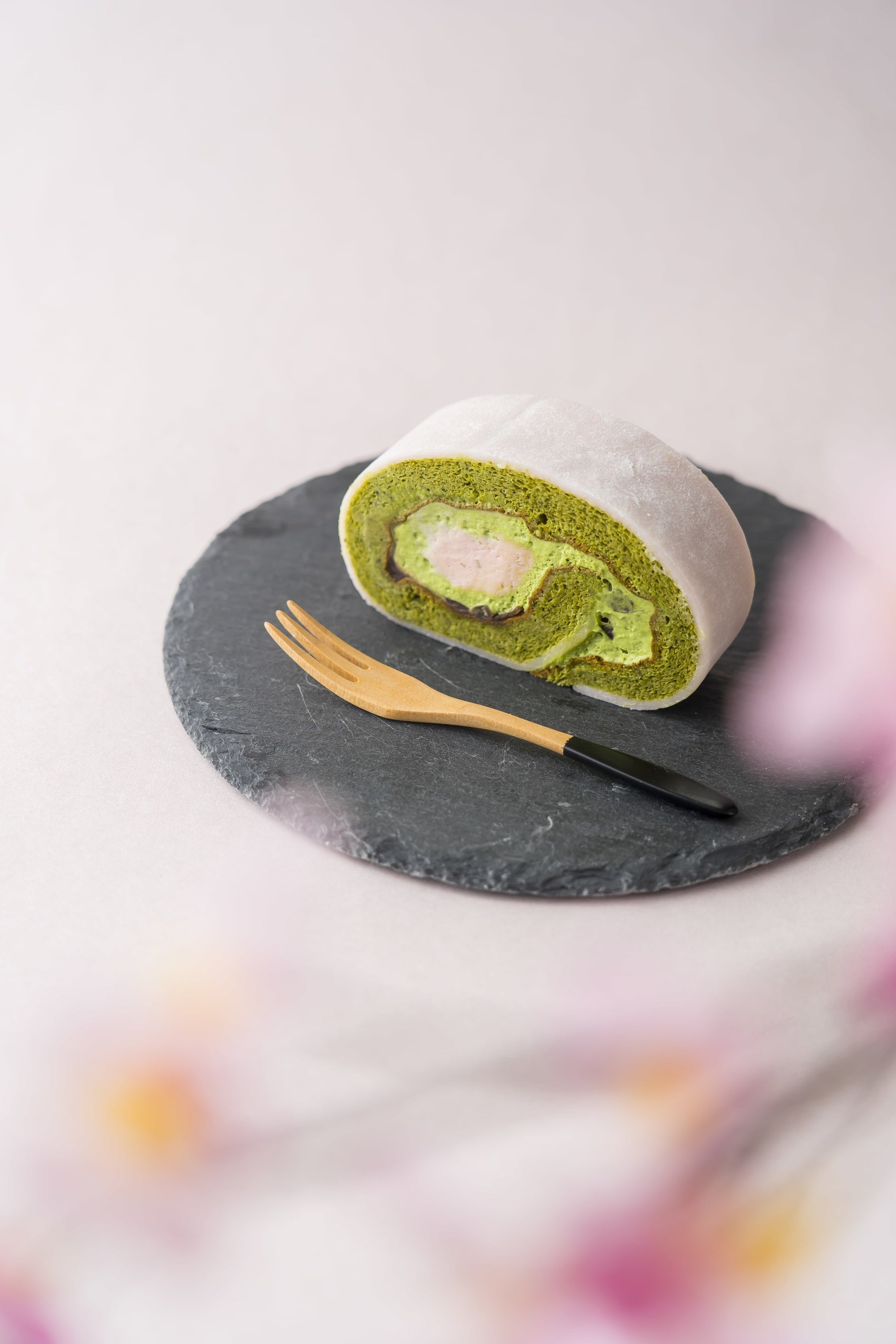 人気の抹茶ロールケーキをベースに、ほろ苦い宇治抹茶生地で桜あんを加えたクリームと抹茶クリームをたっぷりと巻き込み、ほのかな桜色の求肥で包み込みました。