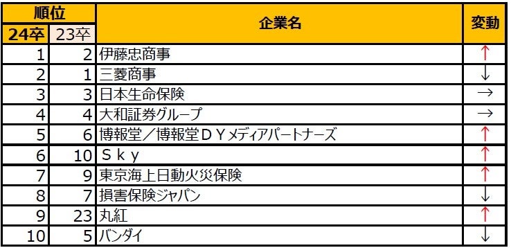 商社・金融系は軒並み順位を上げている。コロナ禍で安定を求める学生が増え、大手志向が増加傾向にあることと、早期のインターンを中心としたプロモーション量が大きく影響していると考えられる。また、ITや食品も大幅に順位を上げる企業が多い一方で、マスコミ・エンタメ系は順位を下げる結果となった。