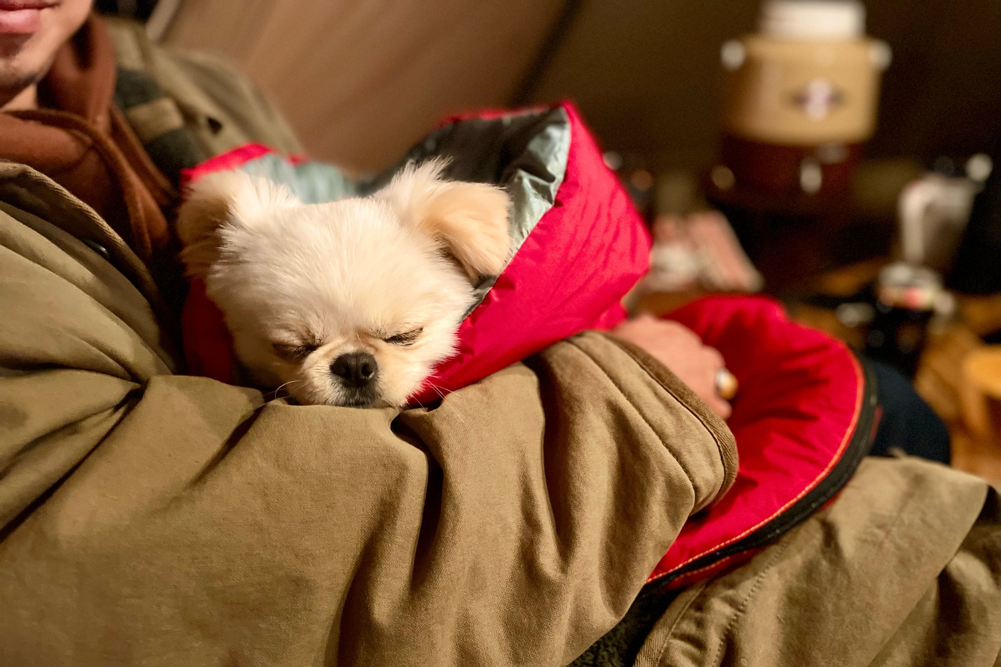 暖かくて軽い羽毛がつまった犬用スリーピングバッグは、まるで羽毛布団につつまれているような寝心地。