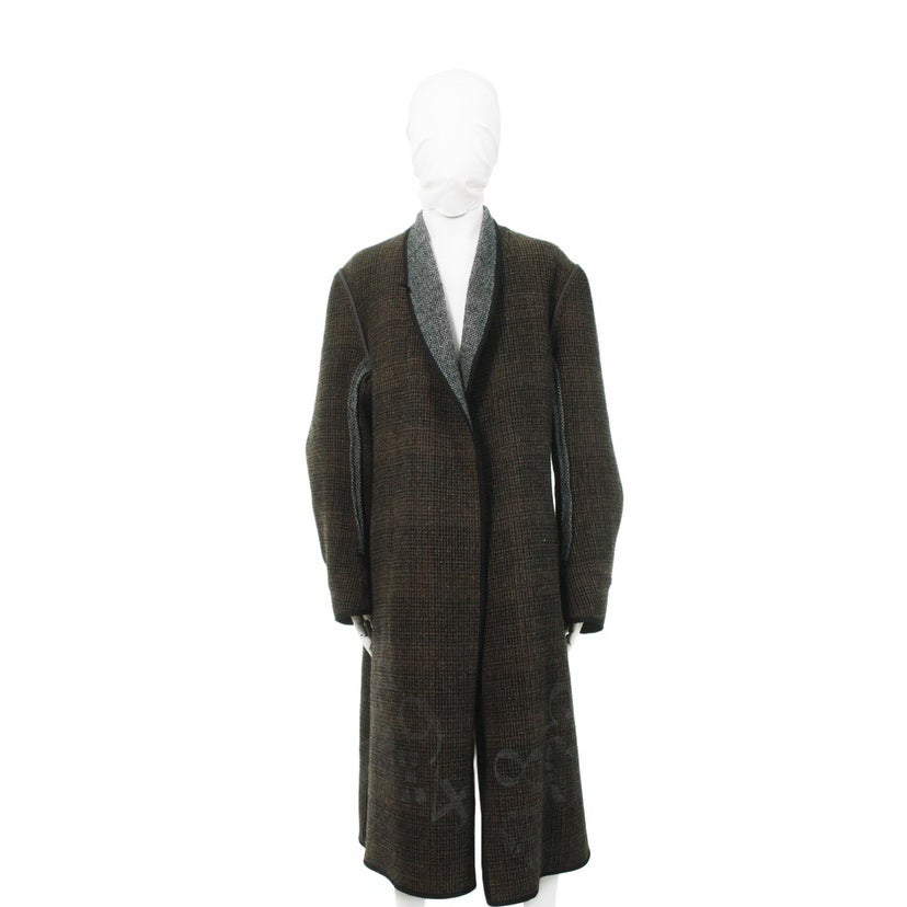 数字のプリントが特徴的なチェック柄のガウンコート。リラックスや解放をテーマに、ホームウェアを意識したワードローブが多いコレクションとなっております。