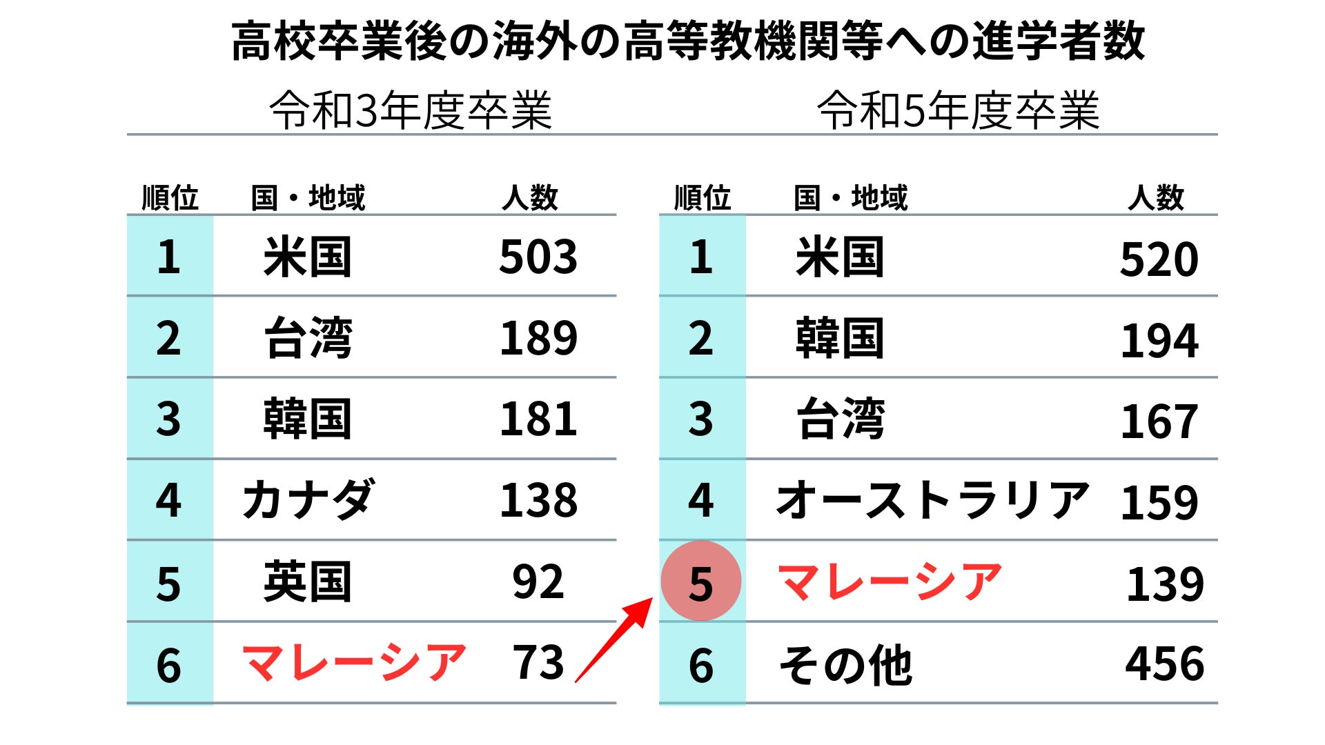 注目すべきは、マレーシアが高校卒業後の高等教育海外進学先として人気のカナダ・英国を抜いて初めて5位にランクインし、英語圏中心からアジア圏へとニーズが広がる象徴的な変化が見られます。