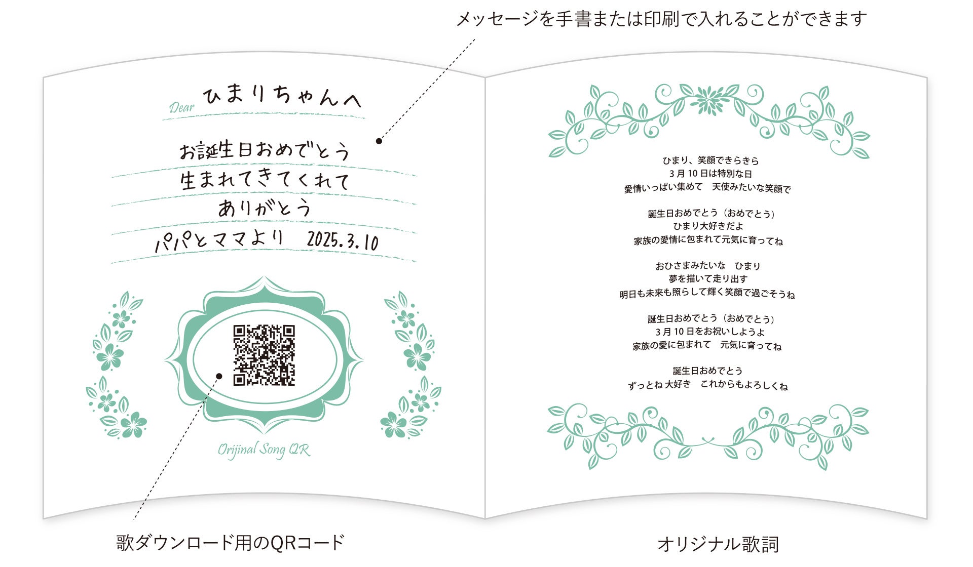 お届けする歌詞カードより、QRコードから歌をダウンロードしていつでも聴くことができます。 音彩メモリーカードには、メッセージが手書きで書けるスペースもあります。心のこもったメッセージを添えて、より一層特別な贈り物にしましょう。