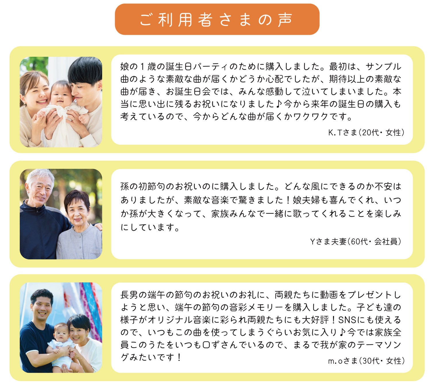 『音彩メモリー』では、贈る相手やシーンに合わせて歌詞やメロディを完全オリジナルで制作します。お誕生日、桃の節句、端午の節句といったお祝いのシーンに最適な楽曲をご用意します。さらに、今後は他のお祝いシーンにも対応範囲を広げ、より多くの特別な瞬間を音楽で彩っていく予定です。