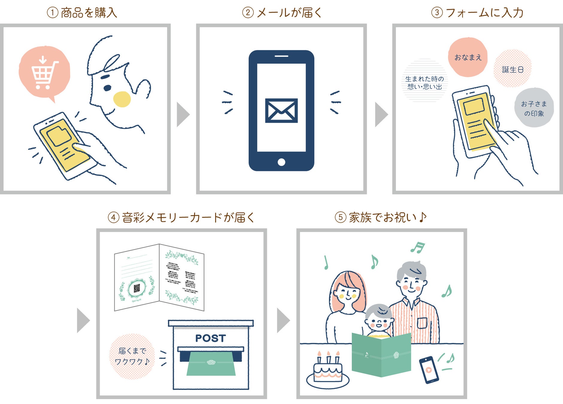 オリジナルソングを音彩メモリーカードに載せてお届けします。お申込みフォームより、お子さまのお名前や生年月日、贈る相手に向けた簡単な二つの質問から、素敵な歌詞とあなただけのオリジナルソングを制作します。
