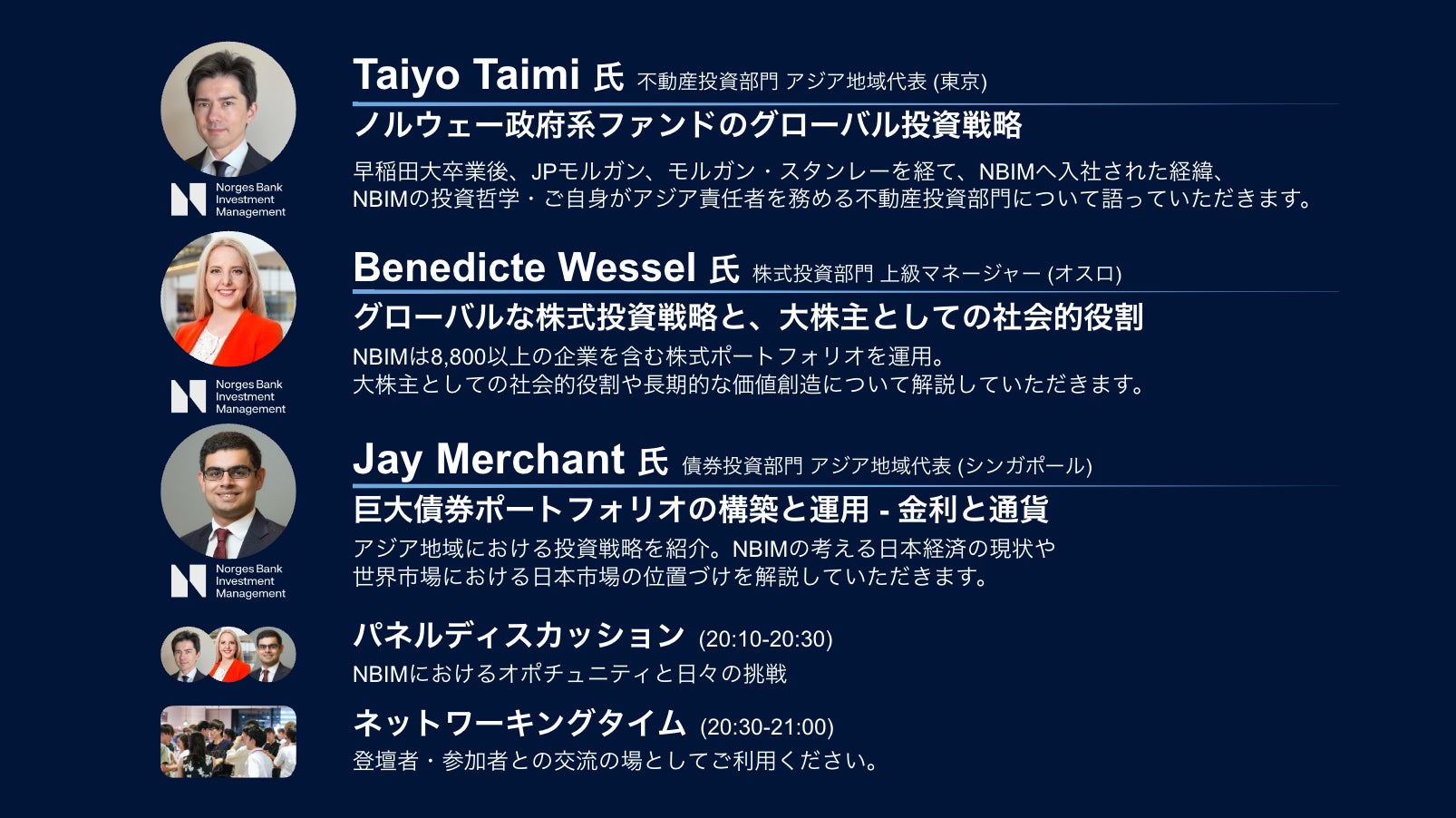 今回の勉強会は、資産運用業界の最前線で活躍されているNBIMのご担当者を各国から講師としてお迎えし、仕事内容、投資戦略等について、実際の経験を踏まえてお話しいただく予定です。 投資に興味を持ち始めた方から、グローバルな金融市場や投資銀行部門を志す方まで幅広く歓迎しております。金融・投資のプロに直接質問する絶好の機会です。