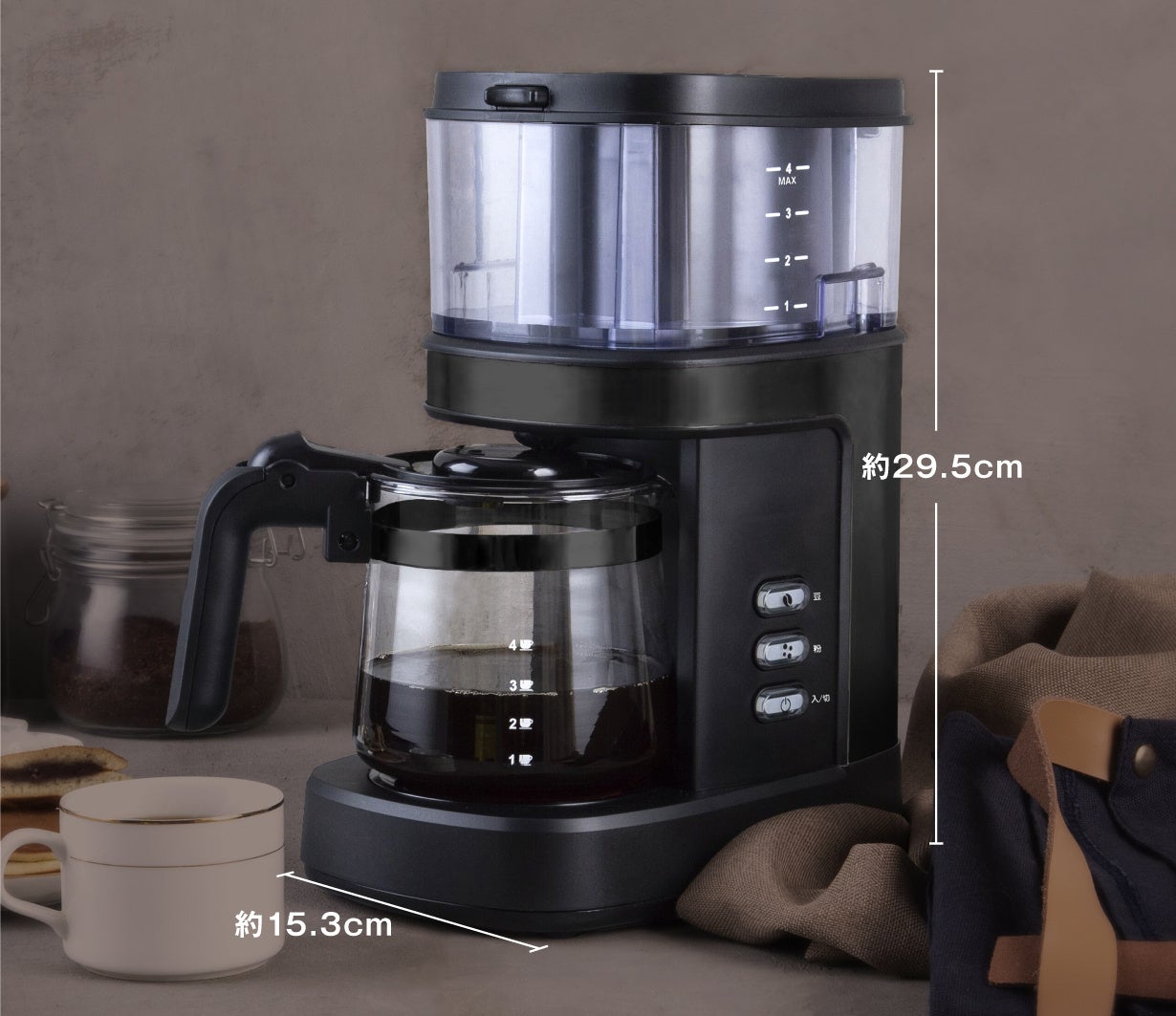 ミル内蔵ながら、コンパクトなサイズを実現。横幅は15.3cmとテーブルの上においても邪魔にならず、収納も楽なのが魅力のひとつ。シンプルなデザインなので、ほかのインテリアとなじみやすいのもメリットです。